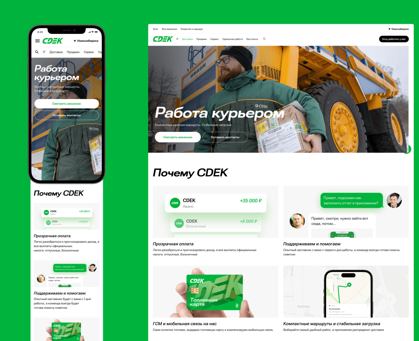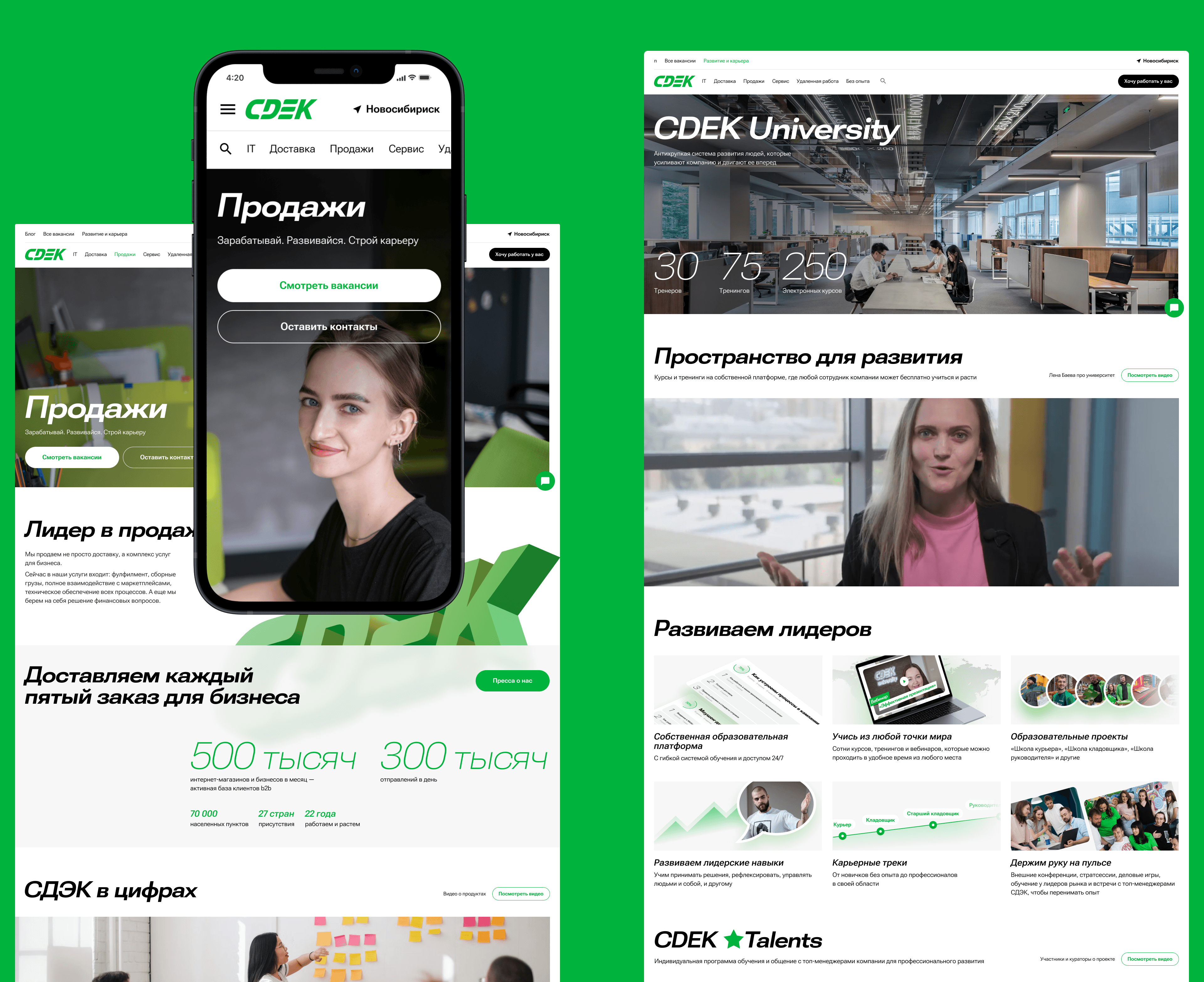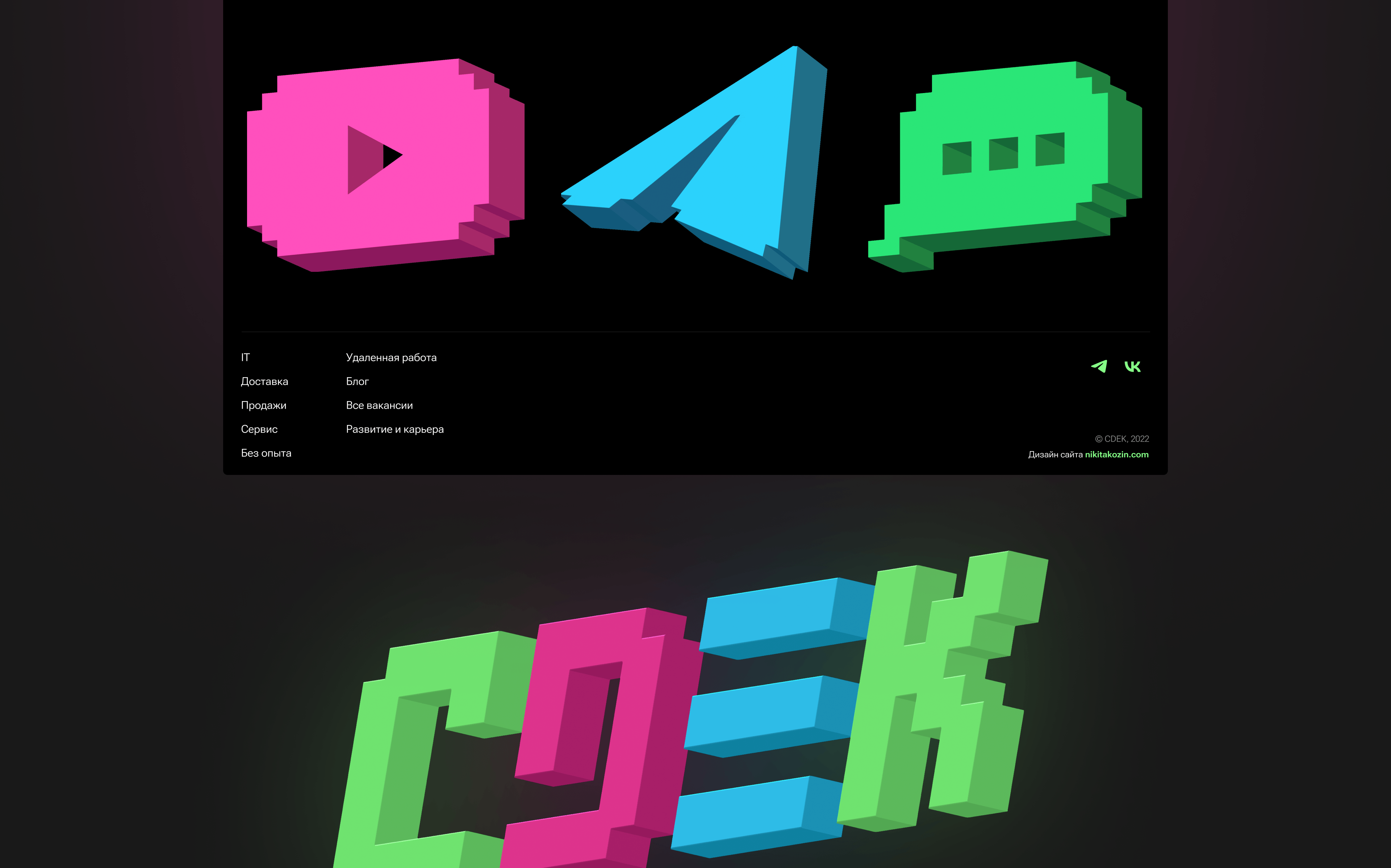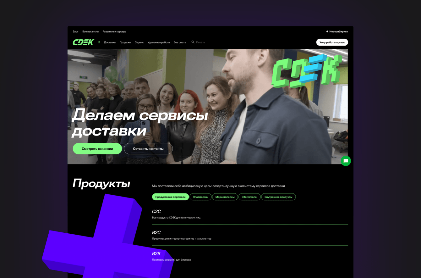 Для IT-направления был сделан большая целевая страница с рассказом о продуктах, структуре команды, преимуществах. Дизайн выполнен в чёрных цветах, чтобы выделить направление среди остальных и подчеркнуть, насколько CDEK ценит разработчиков, ведь разработчики любят чёрный :)