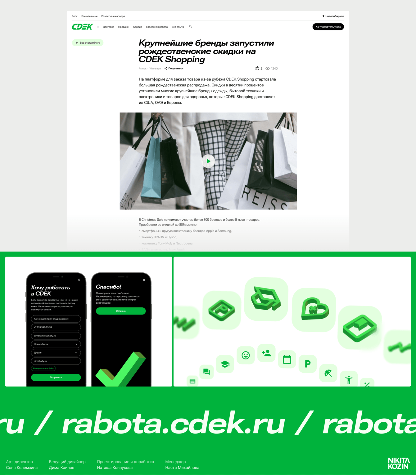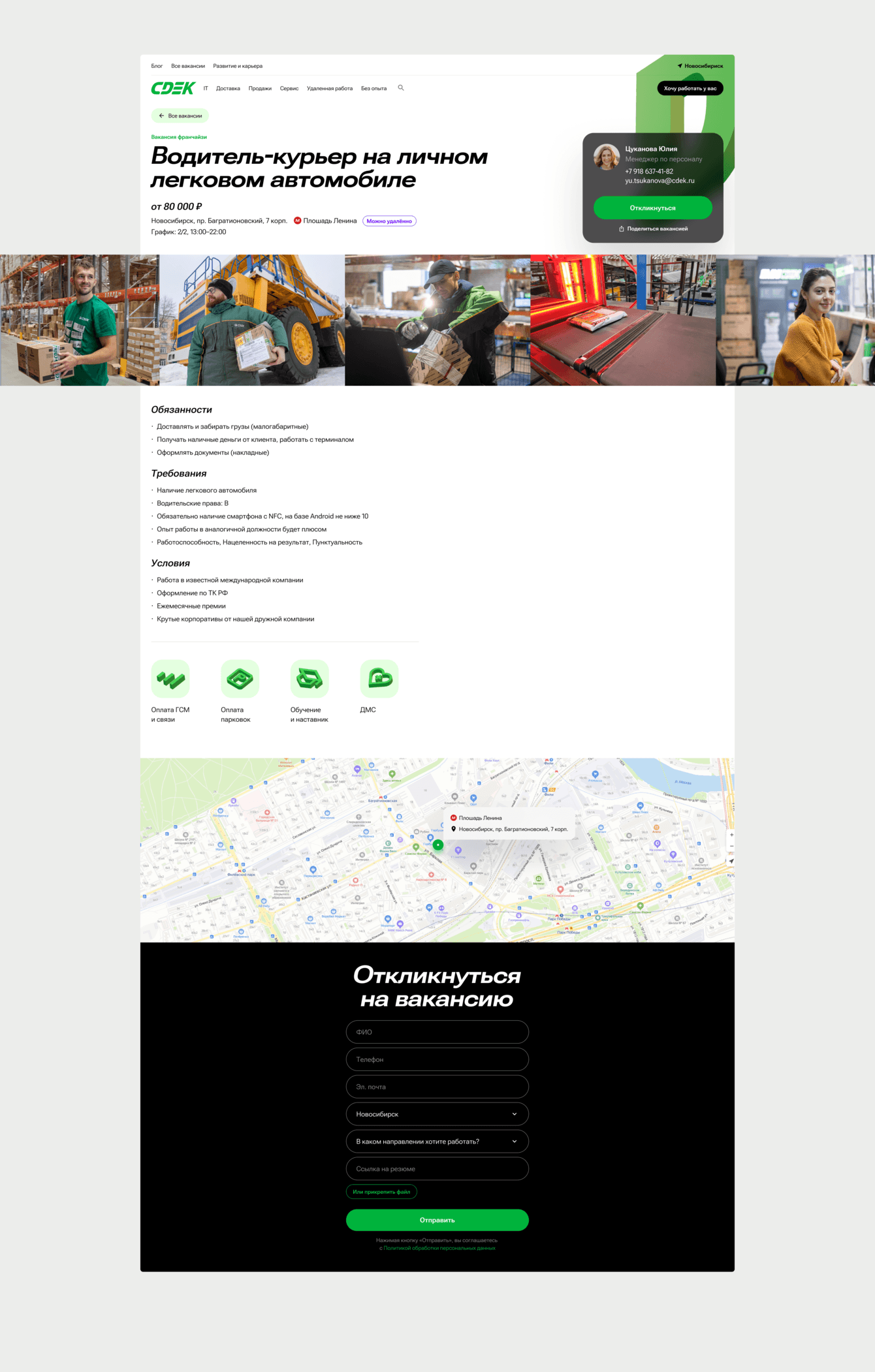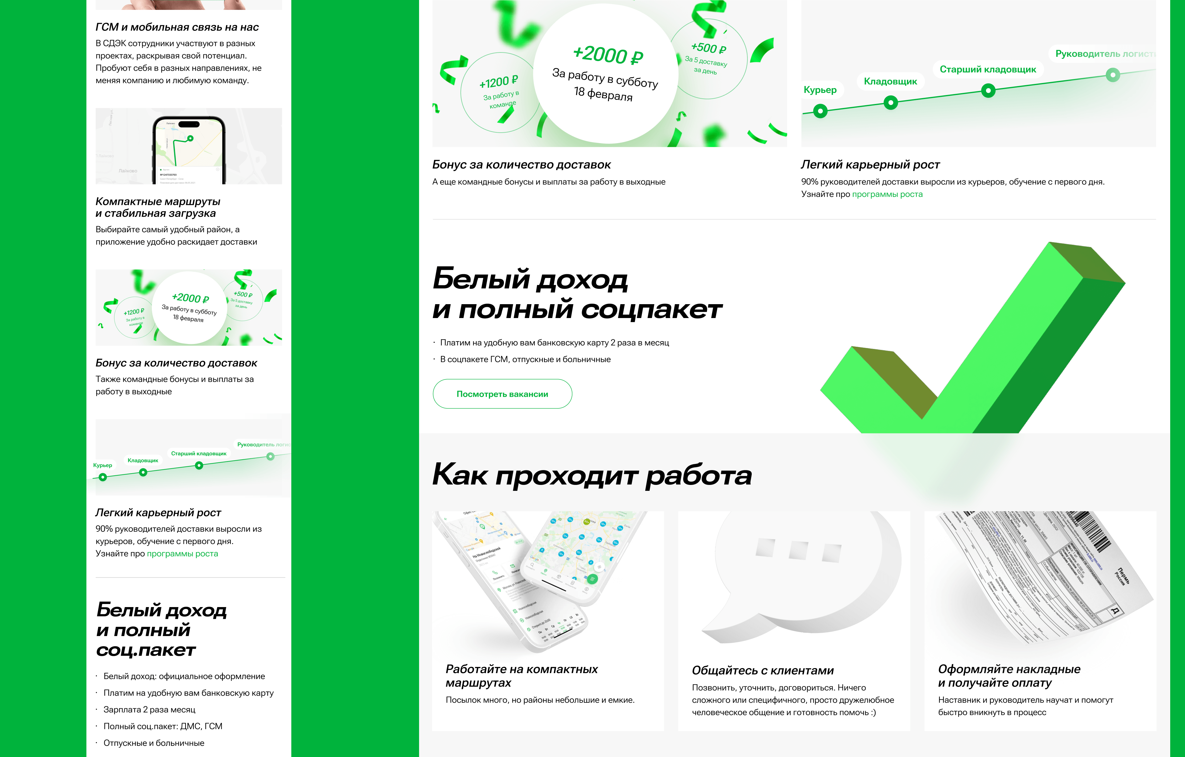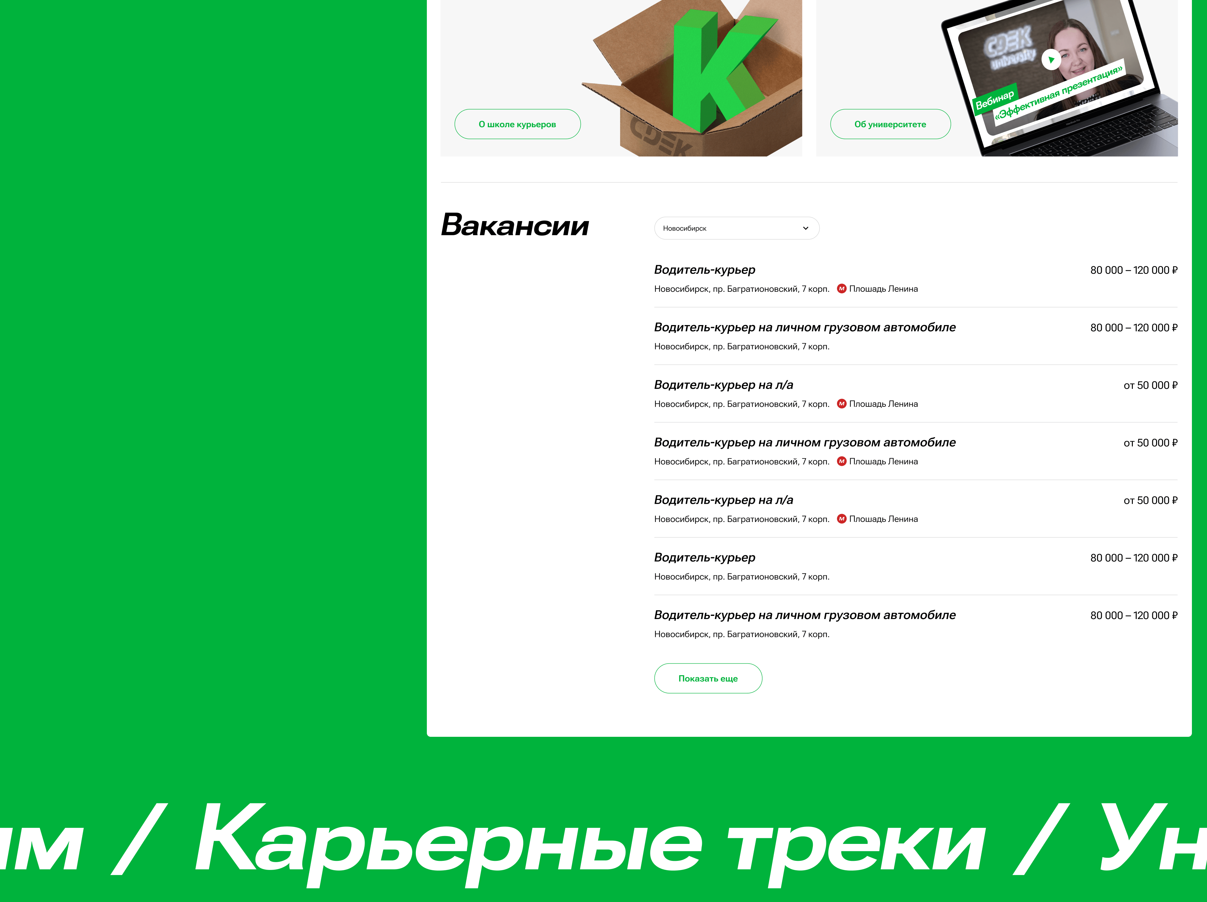 Для IT-направления был сделан большая целевая страница с рассказом о продуктах, структуре команды, преимуществах. Дизайн выполнен в чёрных цветах, чтобы выделить направление среди остальных и подчеркнуть, насколько CDEK ценит разработчиков, ведь разработчики любят чёрный :)