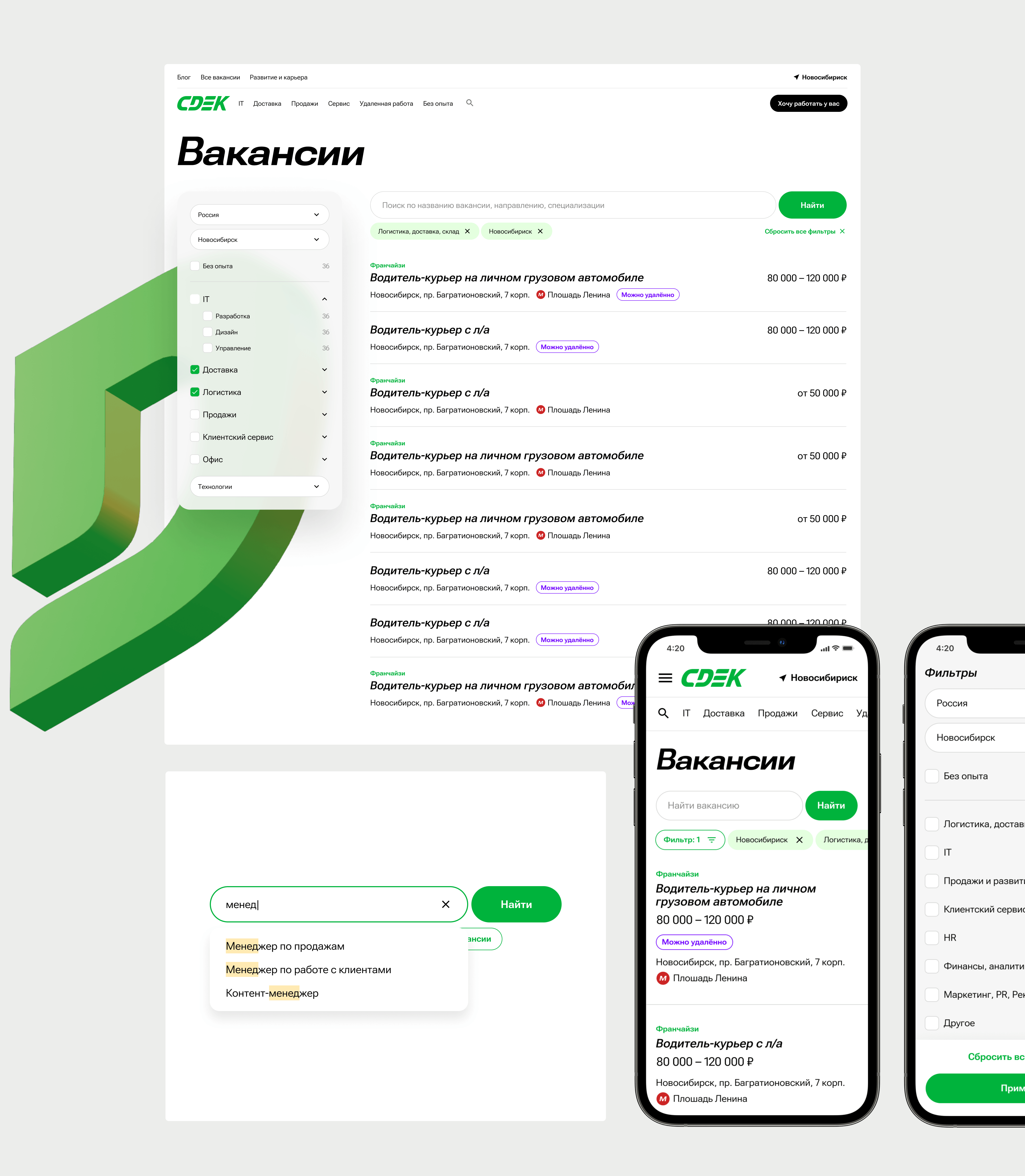 Найти нужную вакансию можно прямо с первого экрана сайта или пойти дальше на страницу «Все вакансии». Для поиска есть удобные подсказки и фильтры по разным категориям. Удобно даже с мобильных устройств.
