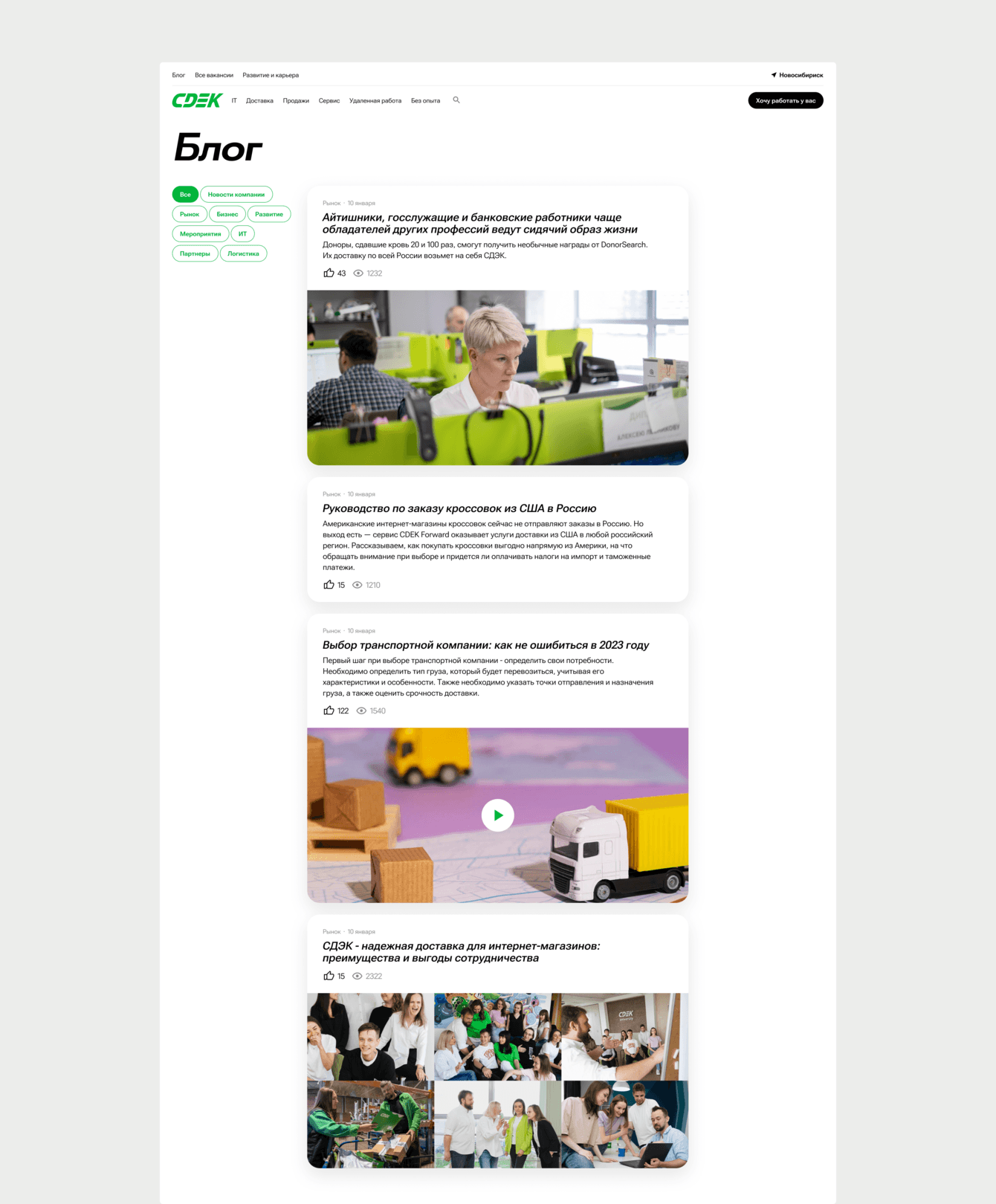 Разработали блог, с помощью него удобно вещать о последних новостях компании или детально рассказать о новом направлении. Главная блога — это лента новостей. За лентой легко следить и читать: карточки большие и текст крупный. Контент в них может быть как видео, так и картинка.