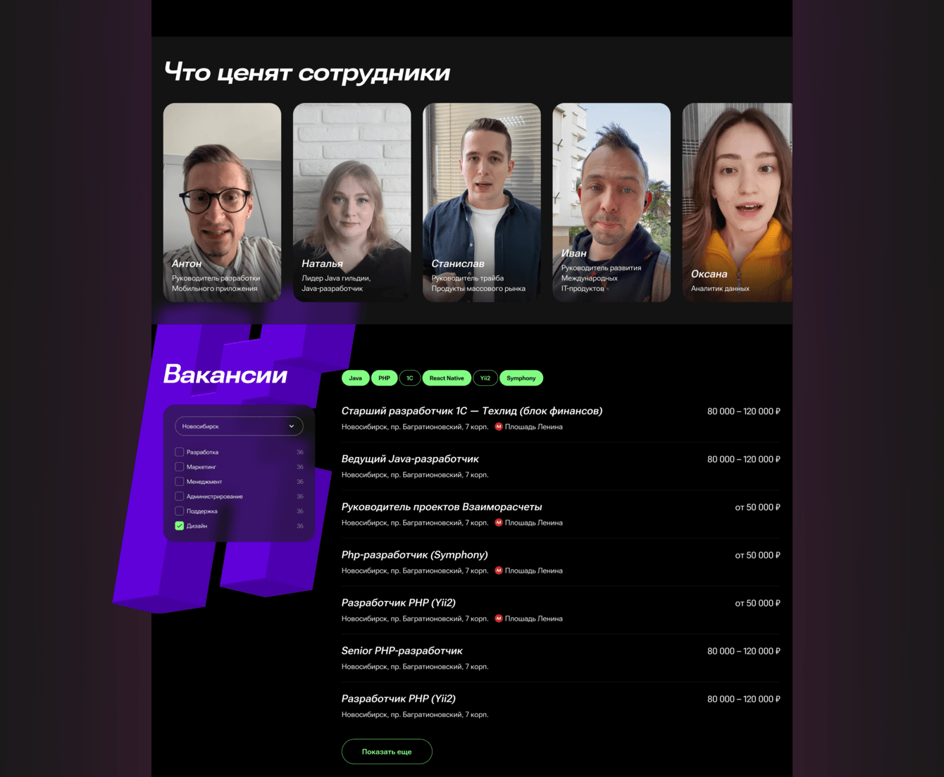 Разработать сайт с вакансиями для привлечения соискателей, который бы передавал ценности компании и рассказывал о преимуществах работы в ней.