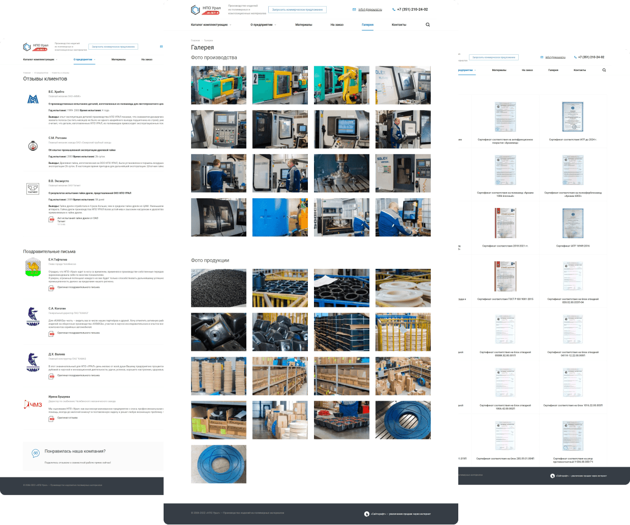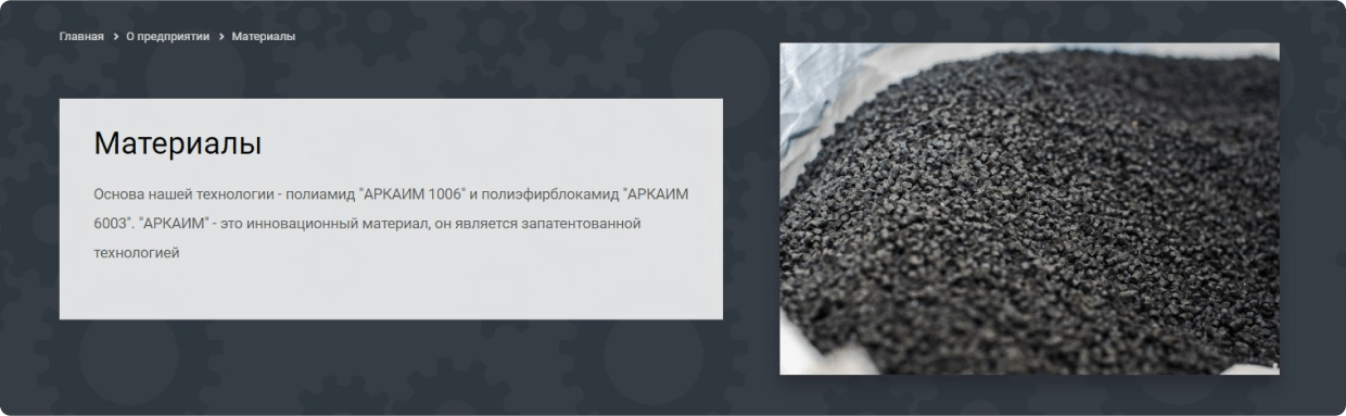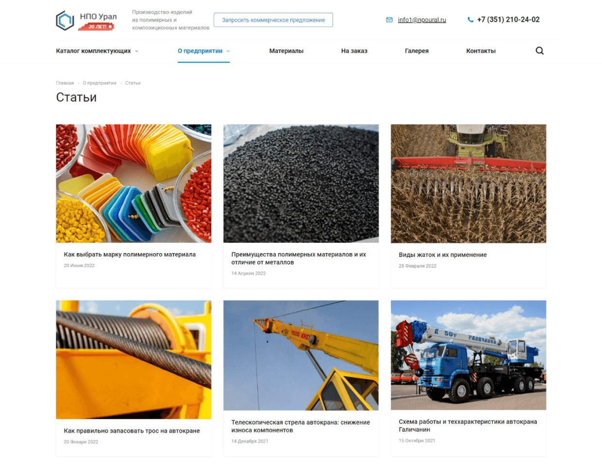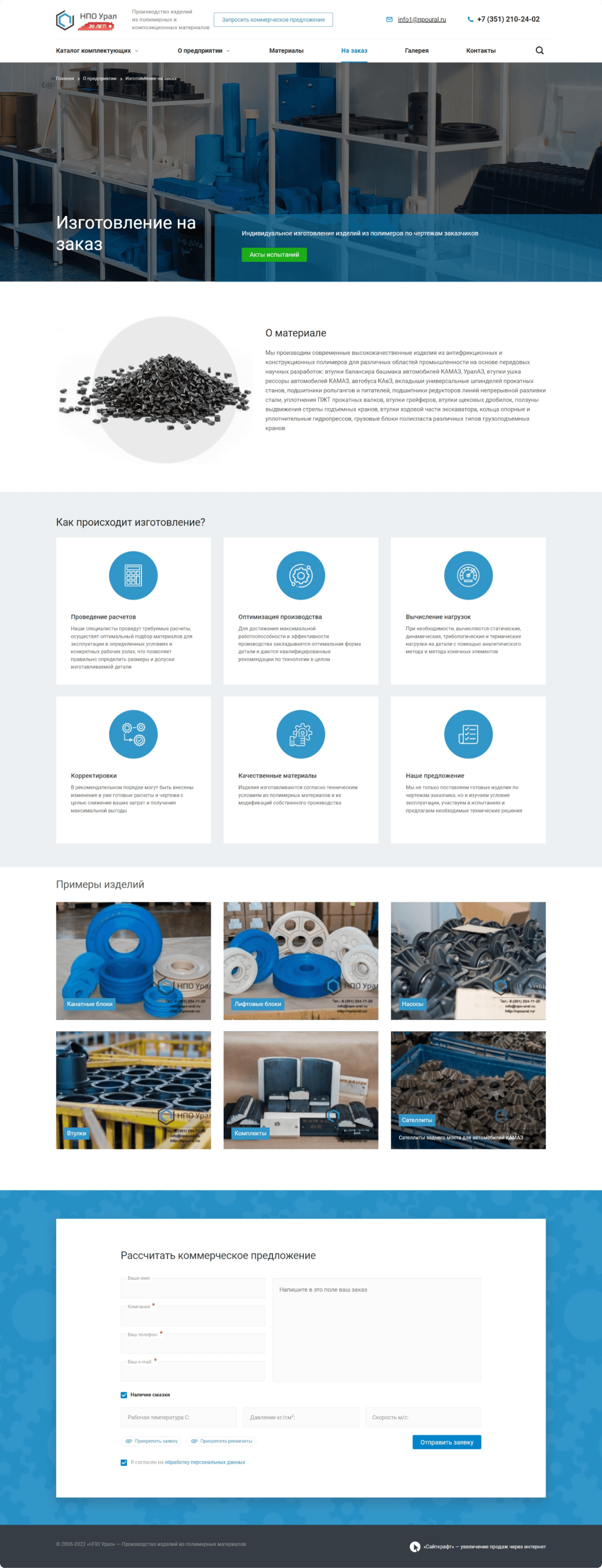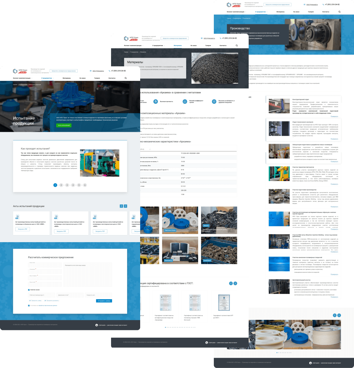 Разместили информацию о материлах, производстве и испытаниях продукции. Это помогает посетителям сайта увидеть выгоды от покупки изделий из полимерных и композиционных материалов.