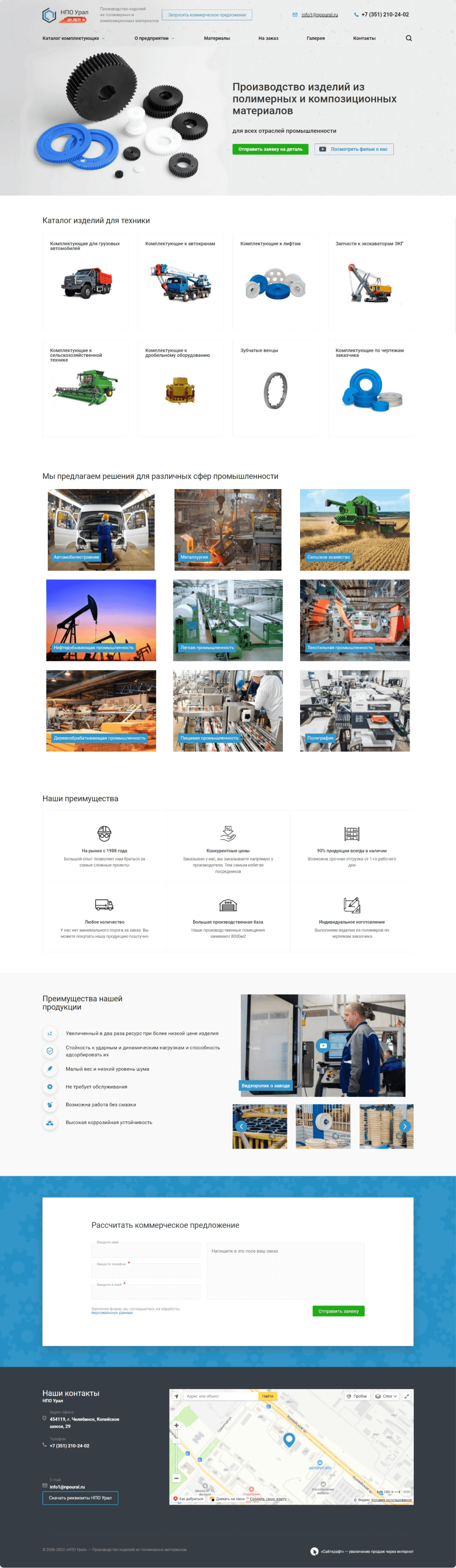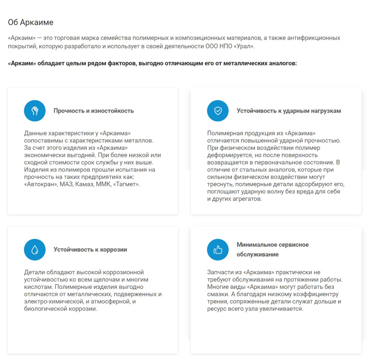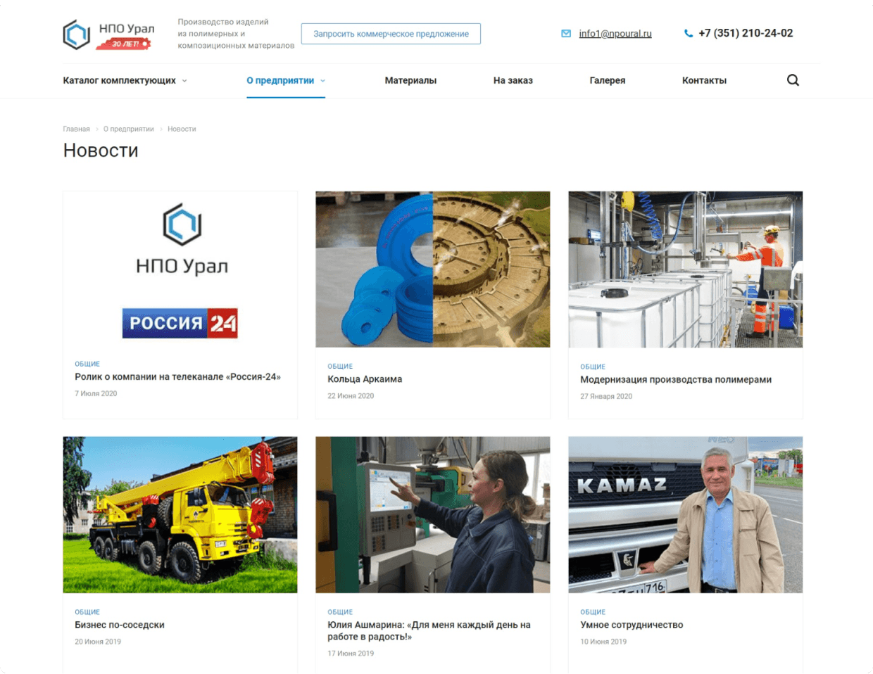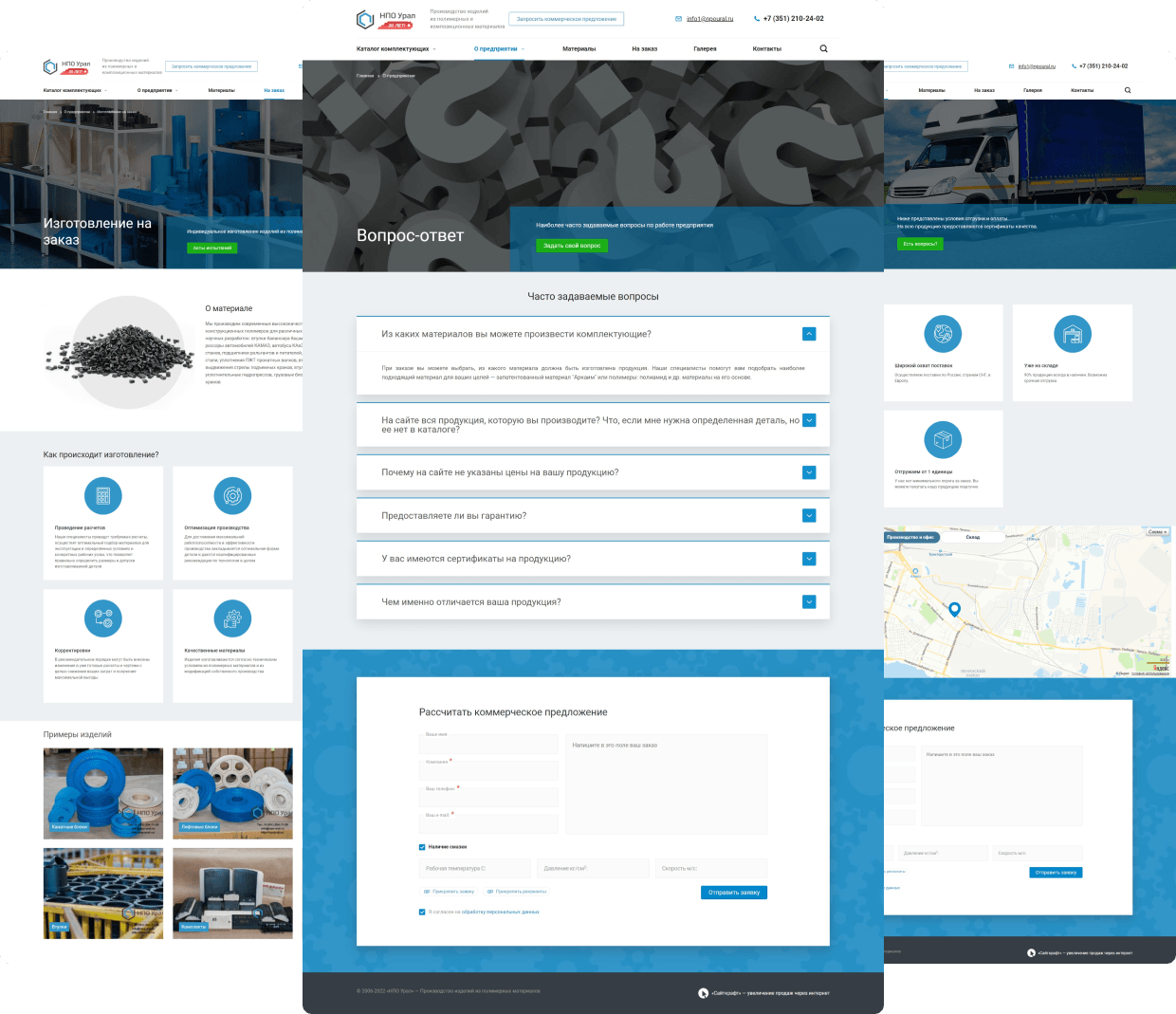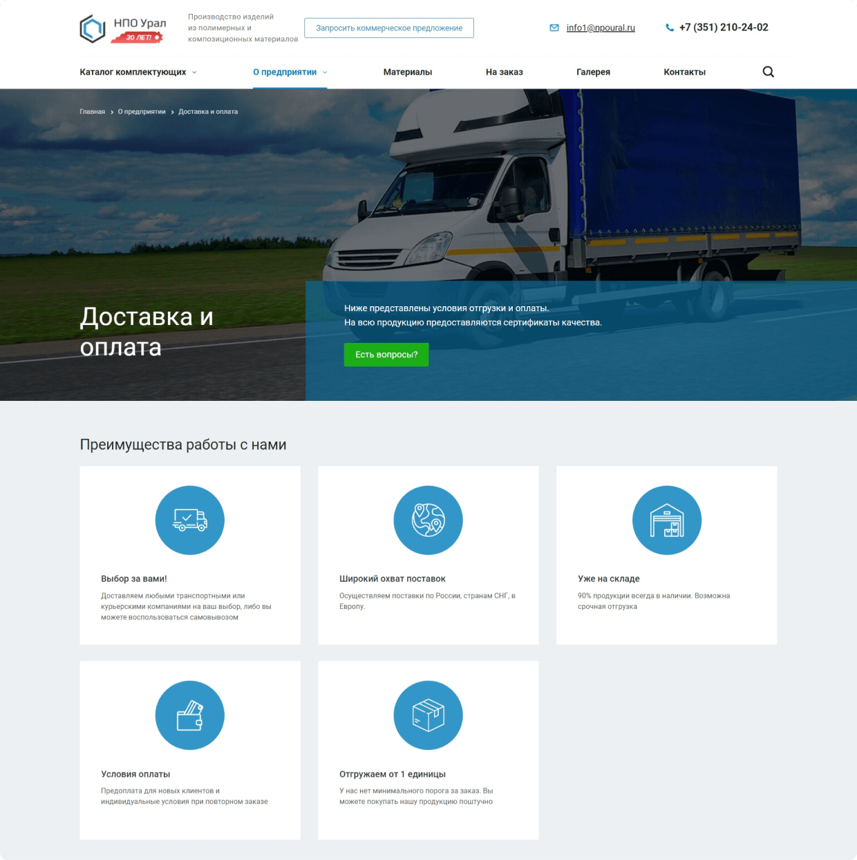 Разместили информацию о материлах, производстве и испытаниях продукции. Это помогает посетителям сайта увидеть выгоды от покупки изделий из полимерных и композиционных материалов.