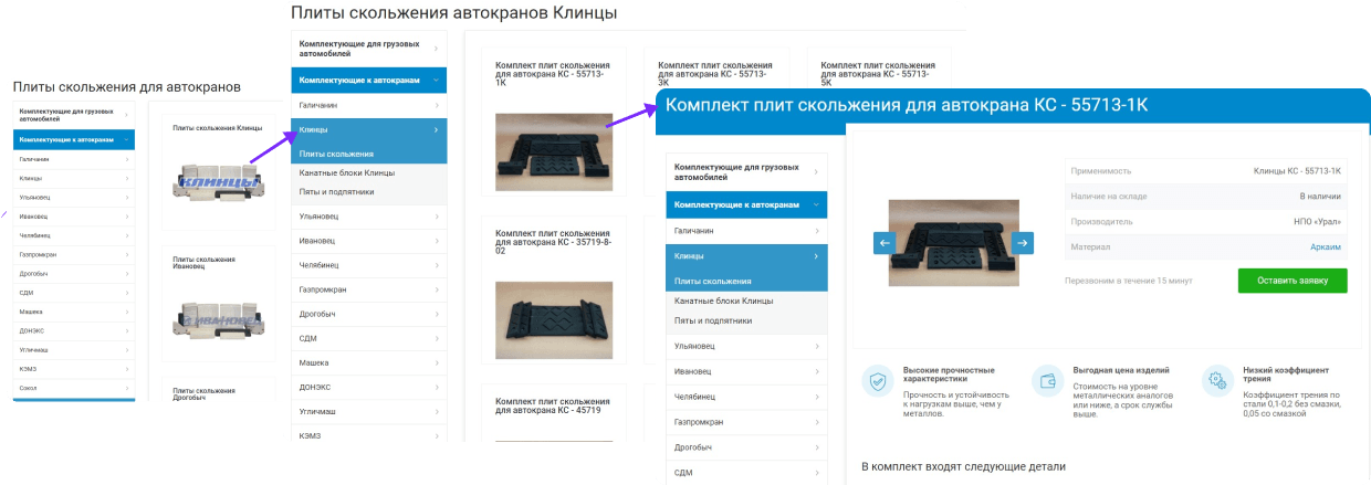 Или, например, сделали, чтобы со страницы «Плиты скольжения» можно было перейти на разводящую страницу, затем на отдельную конечную страницу.