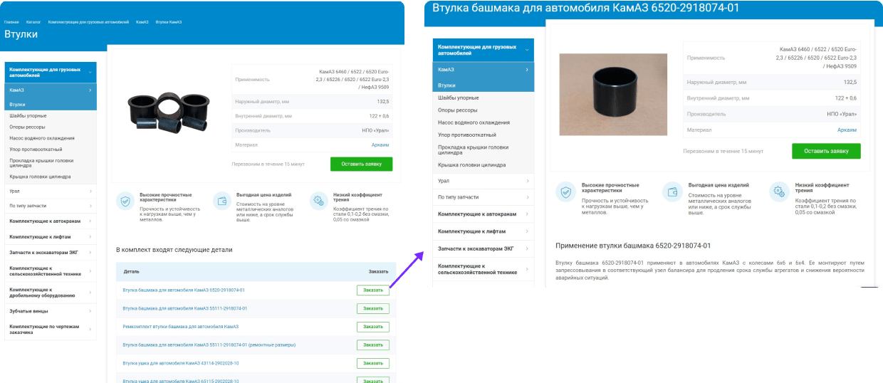 Например, втулка может быть изготовлена из металла, а может — из пластика. Фактически, мы предлагаем товар, а потом в карточке товара даём расшифровку об уникальном материале.