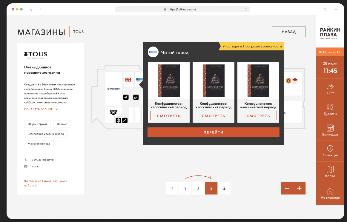 Интерактивная карта ТЦ, на которой отмечены магазины и локации мероприятий и мастер-классов. У каждого магазина, участвующего в Программе лояльности, есть всплывающая плашка.