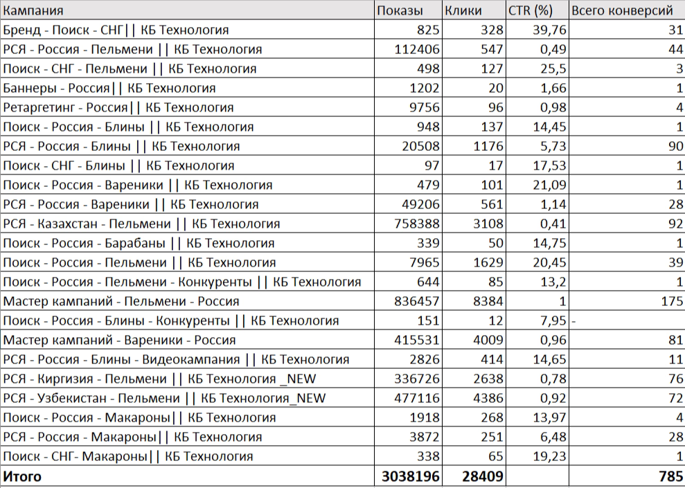 На данном этапе прекрасные результаты показывают Узбекистан и Киргизия. Сводная таблица эффективности рекламных кампаний приведена ниже: