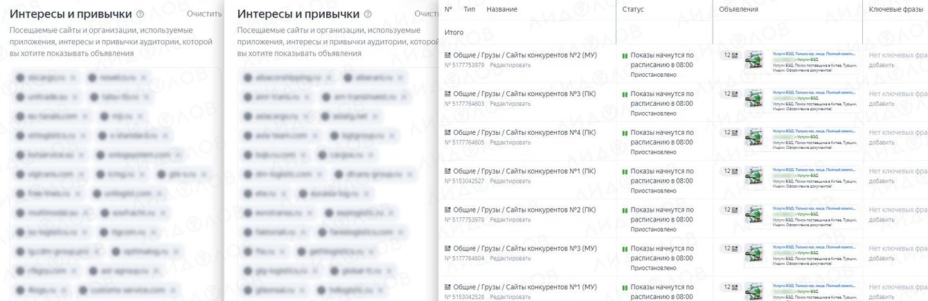 Для дополнительного охвата рекламы собрали порядка 120 сайтов конкурентов по тематике международных грузоперевозок и ВЭД. Так же взяли в работу краткосрочные интересы «Грузоперевозки и транспортные услуги». Забегая вперёд - это было совершенно бесполезно :))