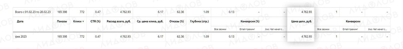 Результат за первый месяц так себе - 1 звонок из 772 кликов. Стоимость лида 4762 руб. (без НДС).