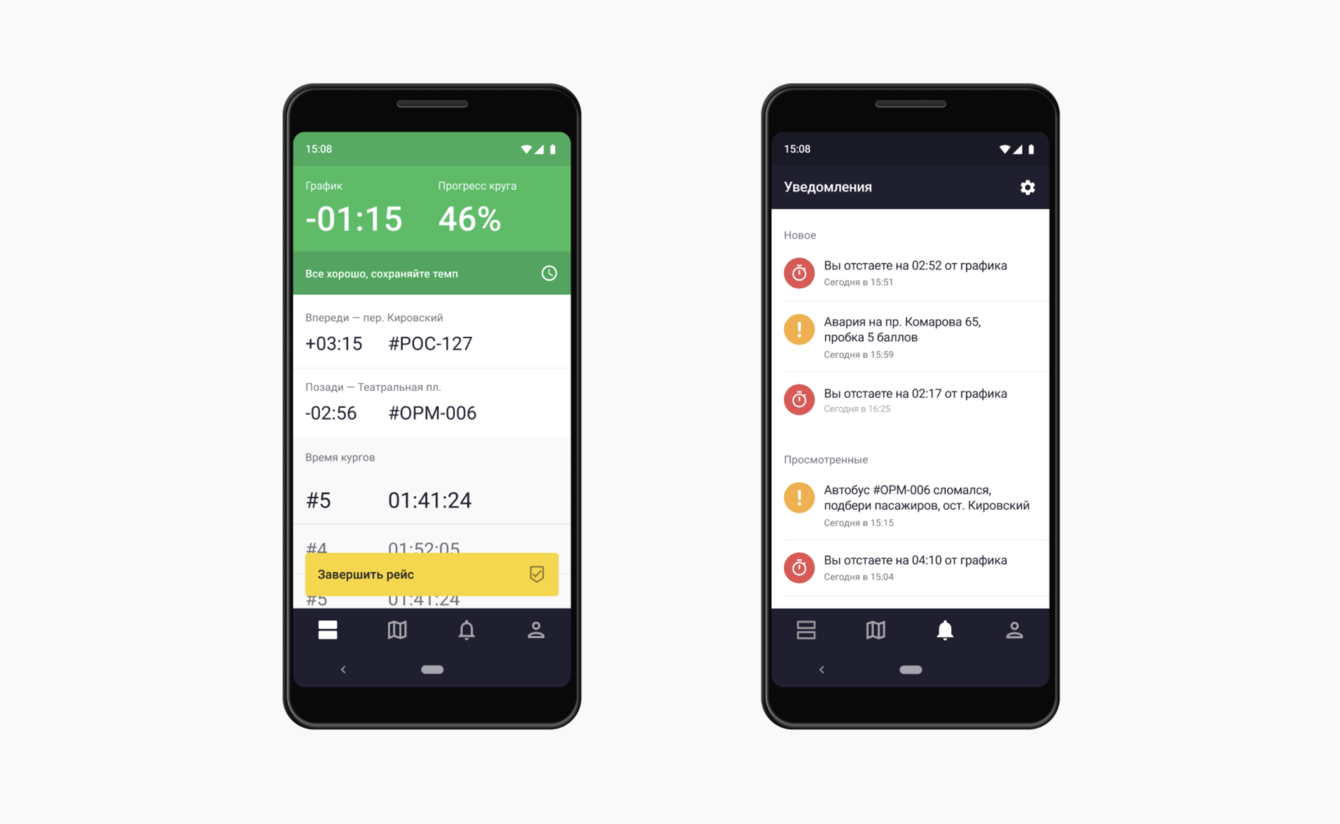 Мы разработали современное мобильное приложения для водителей. В дизайне сделали акцент на наиболее важной информации — соответствие графику. Если автобус спешит или опаздывает слишком сильно — фон шапки красится в красный, если он идет по графику — в зеленый