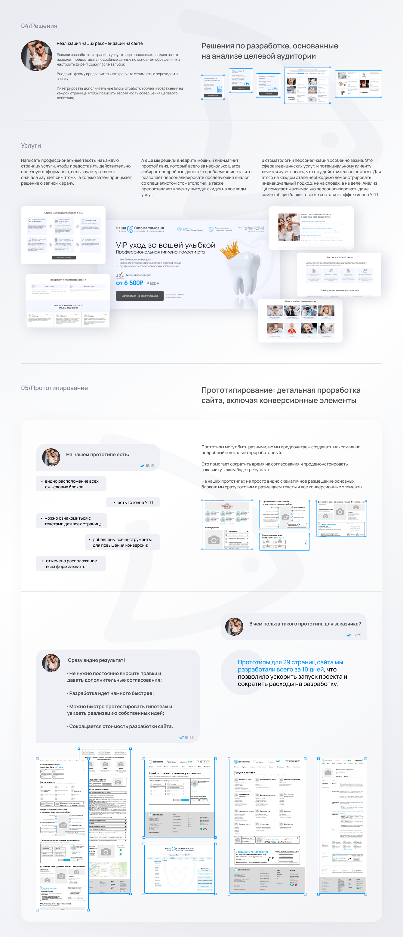Список можно продолжать, и именно это мы и сделали до начала всех работ: детально проработали ЦА, выписали ключевые боли и отработали их, и составили для клиента подробный отчет. В нем мы не просто сухим маркетинговым языком перечислили факты, понятные только нам, а подробно рассказали, на кого важно ориентироваться при разработке сайта и какие инструменты необходимо внедрить, чтобы на старте снизить процент отказов и увеличить конверсию.