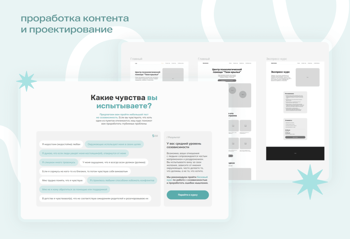 Контент от заказчика мы сократили под новую подачу, сделали его структурированным и выстроили логичный путь пользователя: от знакомства с центром до финального решения о записи. Чтобы вовлечь человека в процесс, добавили интерактив — тест на уровень созависимости. Он позволял пользователю взаимодействовать с сайтом через личный опыт, позволяя давать место чувствам.