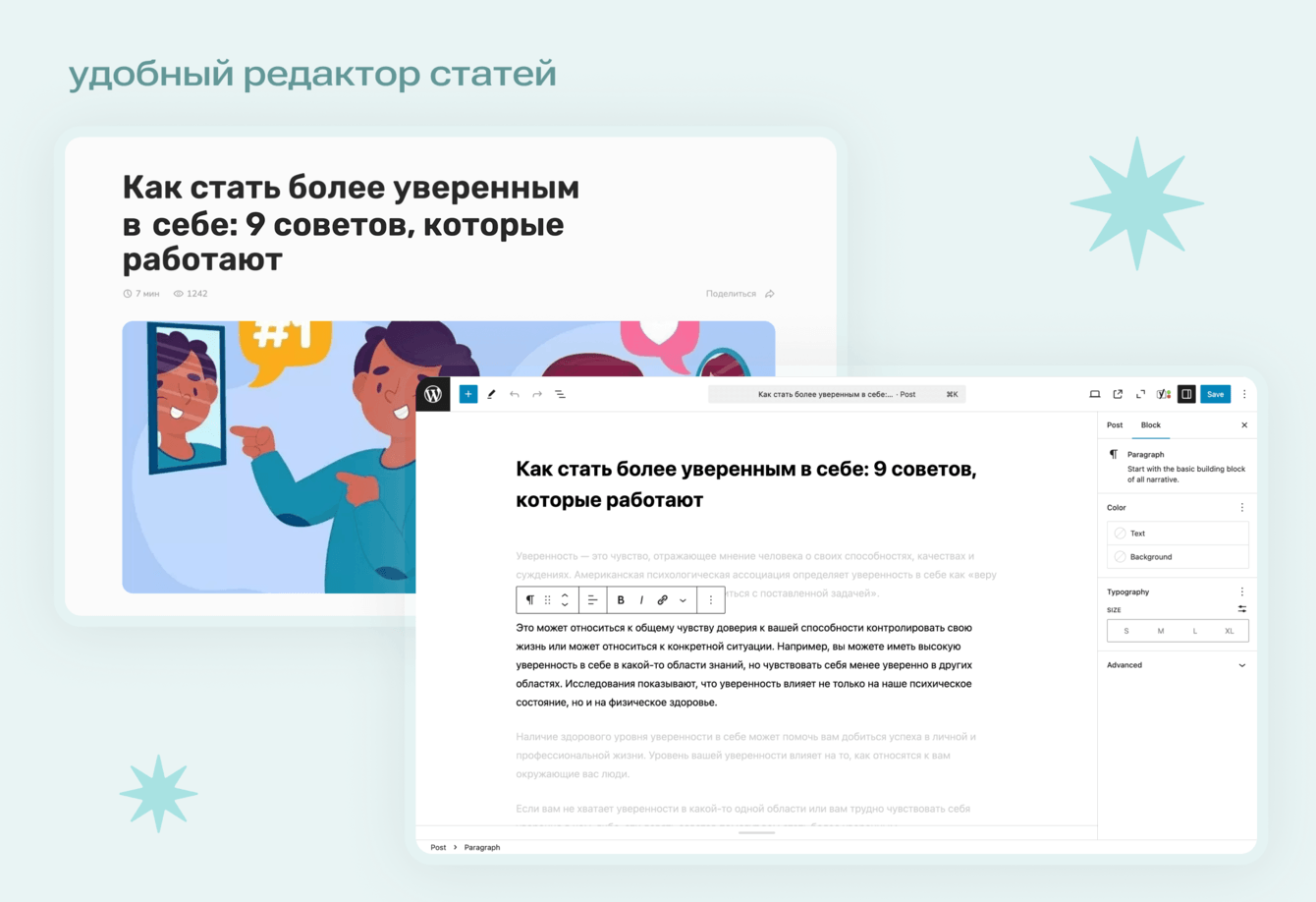 Для удобства работы с медиажурналом реализовали возможность самостоятельного добавления и редактирования статей через редактор Gutenberg. Он позволяет заказчику без технических навыков управлять контентом, форматировать текст, добавлять изображения и тесты. Чтобы статьи выглядели органично и соответствовали стилистике сайта, доработали интерфейс редактора и создали готовые шаблоны для статей.