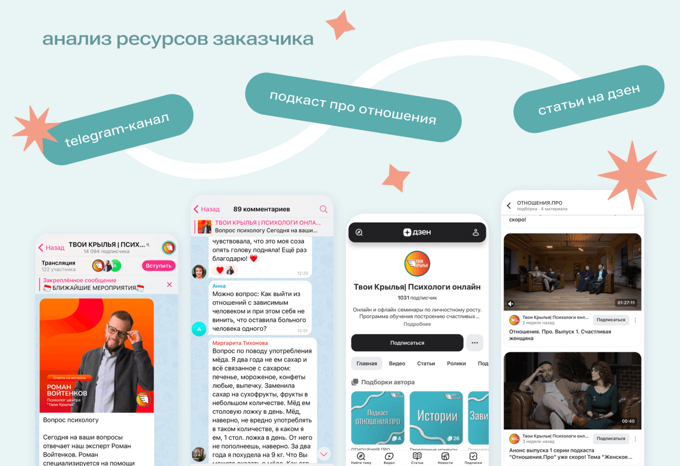 На старте работ мы провели серию экспертных интервью с командой центра, чтобы понять, как выстроена работа специалистов, с какими запросами приходят клиенты и что их тревожит в первую очередь. Изучили digital-присутствие заказчика: соцсети, старый сайт и телеграм-канал, который оказался главным активом.