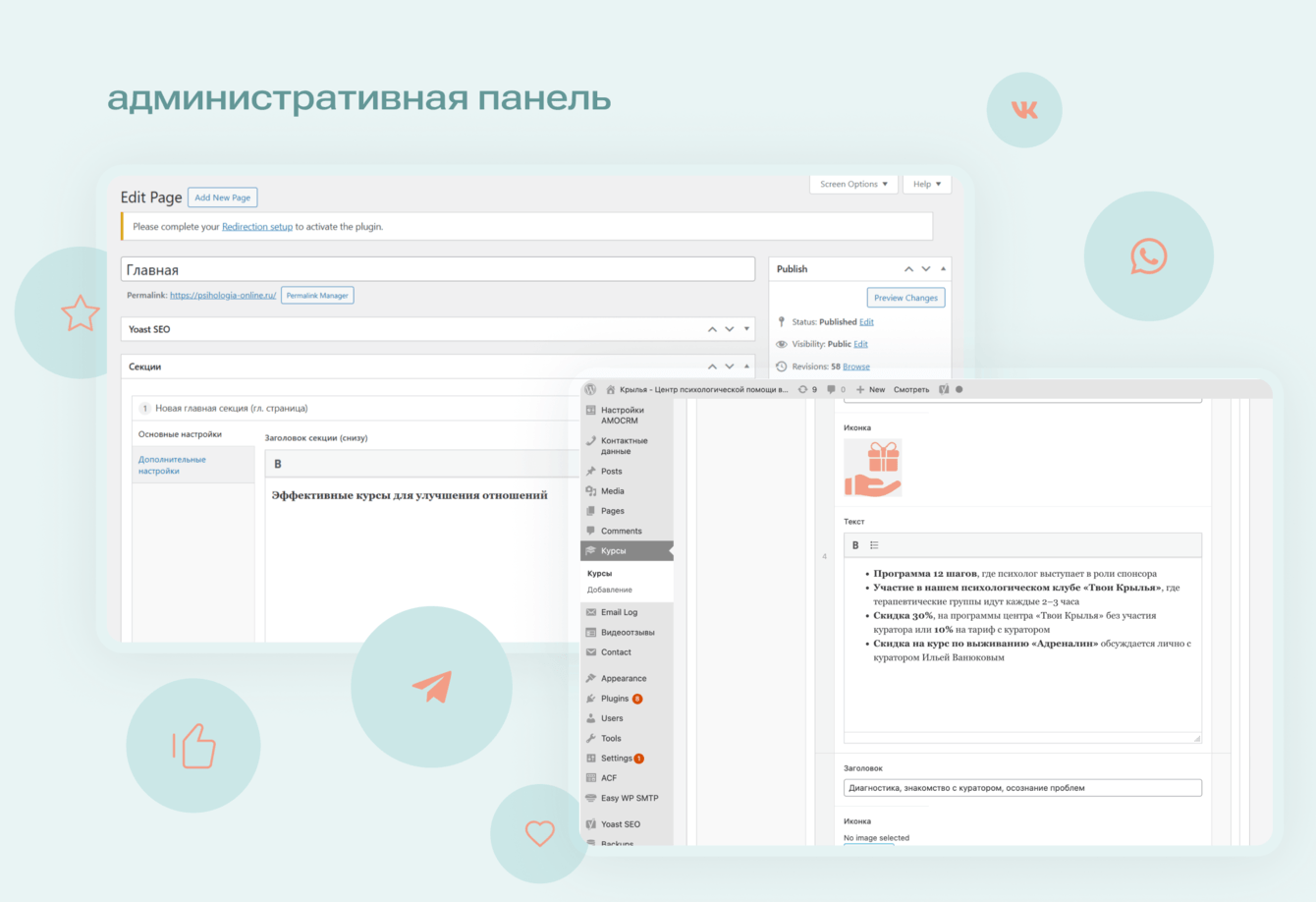 На момент запуска все текстовые материалы и воронка взаимодействия с аудиторией были на уровне гипотез — предсказать, какие форматы и сообщения вызовут наибольший отклик, было невозможно. Поэтому для разработки выбрали WordPress – он позволил создать удобную и масштабируемую платформу в сжатые сроки, сохранив гибкость для дальнейших изменений.