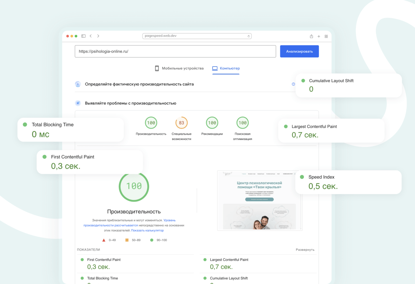 Отдельное внимание уделили скорости загрузки сайта, так как это влияет на конверсию и поисковый трафик. Нам удалось достичь 99% баллов производительности в Google Page Speed. Вместо стандартной схемы загрузки, где все стили и скрипты загружаются одновременно, мы применили динамическое разделение ресурсов: каждая секция сайта подключает только необходимые файлы, что ускоряет загрузку и снижает нагрузку на браузер.