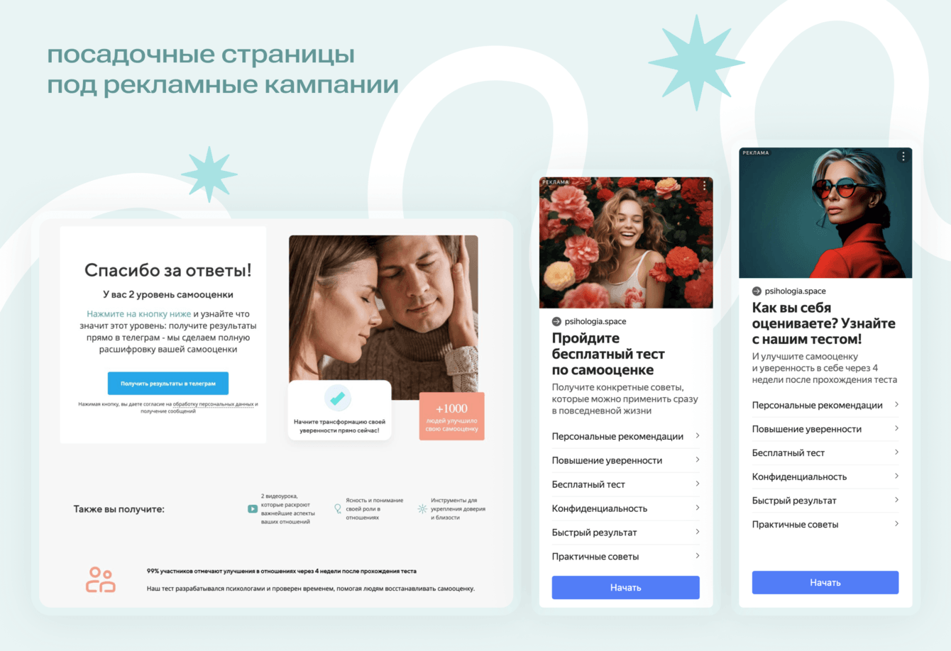Рекламный бюджет был ограничен, а аудитория бота очень широкая, поэтому мы не могли запускаться по всем горячим запросам. Анализ кампаний показал, что тема самооценки объединяет большинство пользователей и имеет высокий уровень вовлечения. На этом основании мы разработали тест для бота, который помогал определить уровень самооценки и давал персональные рекомендации.