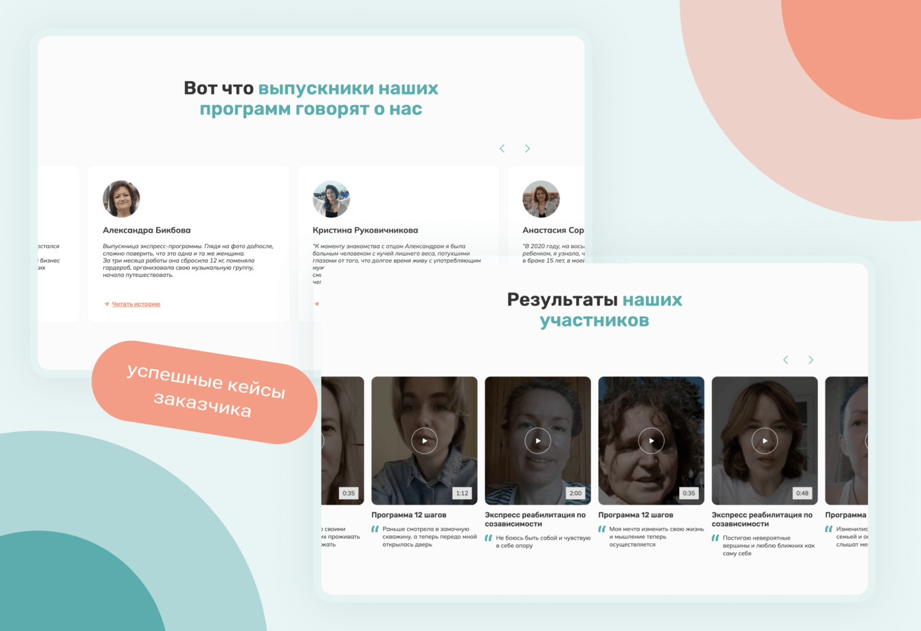 У заказчика было много эмоциональных видеоотзывов, поэтому мы добавили на сайт раздел с ними, чтобы вызвать у пользователей доверие и показать, как люди с похожими проблемами смогли с ними справиться.
