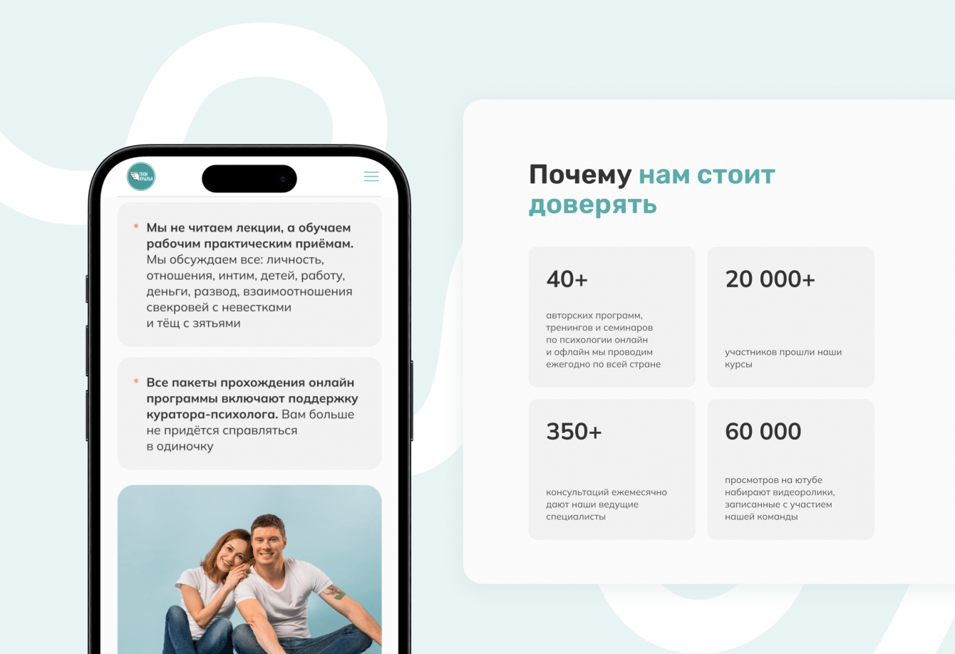 Для каждого курса создали отдельную страницу с чётким описанием программы, ключевых тем и ожидаемых результатов. А чтобы поддерживать связь с аудиторией, добавили лид-магнит — бесплатную памятку по отношениям. Она давала ценность уже на этапе первого контакта, а нам — возможность работать с базой потенциальных клиентов и выстраивать дальнейшую коммуникацию.