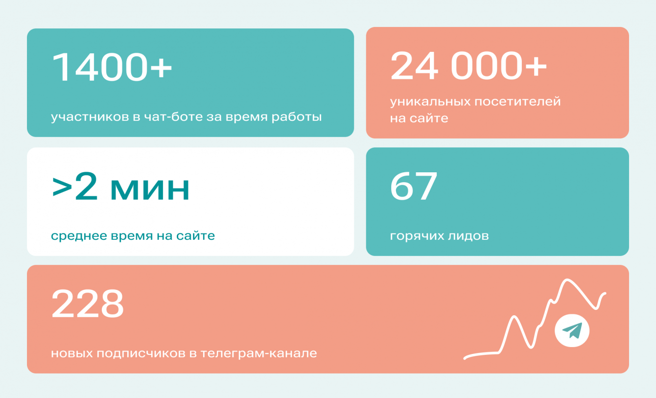 За 3 месяца чат-ботом воспользовались 1 448 человек, из которых 228 подписались на Telegram-канал, а 67 оставили свои контакты для связи.