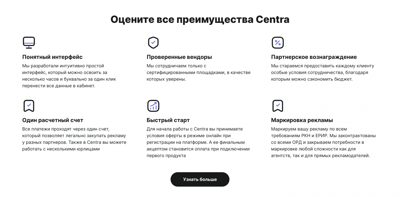 Работа с Centra снижает нагрузку на отдел маркетинга: один контракт с Centra заменяет десятки прямых договоров с площадками при запуске и проведении кампаний. Клиенты Centra оптимизируют затраты на маркетинг за счет улучшения условий закупок, повышения компетенций внутренних команд, упрощения документооборота и ускорения запуска новых кампаний.