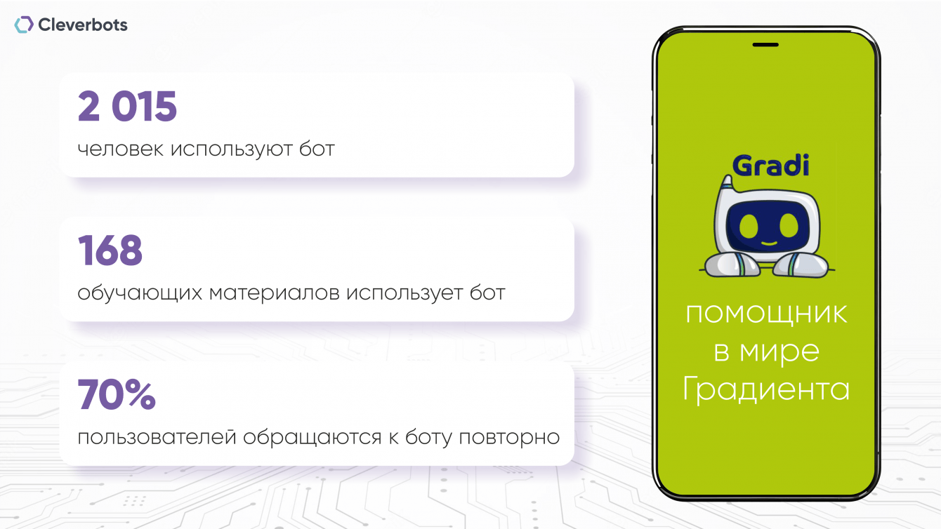 Во-вторых, Гради - это база знаний компании, которая постоянно пополняется. Мы тщательно анализируем, какой информации не хватает сотрудникам и постоянно обучаем Гради новыми вводными. Вместо того, чтобы искать во внутренних папках политики и инструкции, сотрудники теперь могут спросить у бота все, что их интересует.