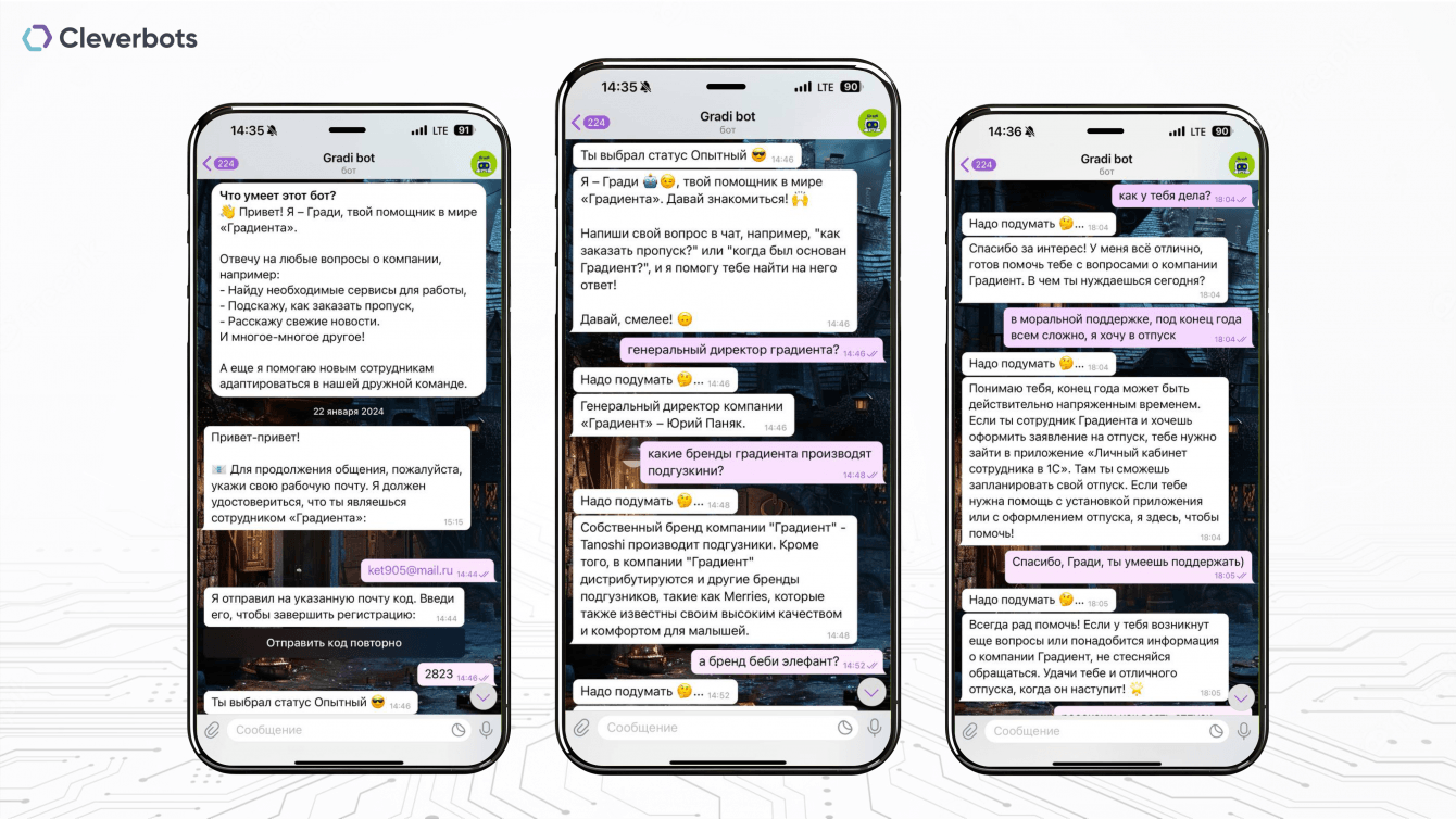 Во-вторых, Гради - это база знаний компании, которая постоянно пополняется. Мы тщательно анализируем, какой информации не хватает сотрудникам и постоянно обучаем Гради новыми вводными. Вместо того, чтобы искать во внутренних папках политики и инструкции, сотрудники теперь могут спросить у бота все, что их интересует.