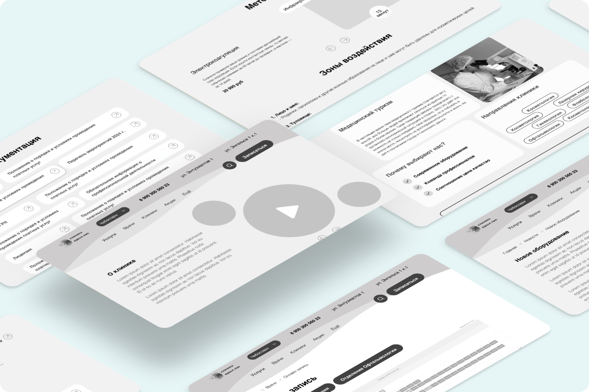 Мы сосредоточились на удобстве навигации, чётком разделении блоков по смыслу и расстановке акцентов: приоритет был отдан формам записи, ключевым услугам и доверительным элементам (отзывы, сертификация, команда врачей). Вайрфреймы стали прочной основой для разработки интуитивно понятного и функционального интерфейса.