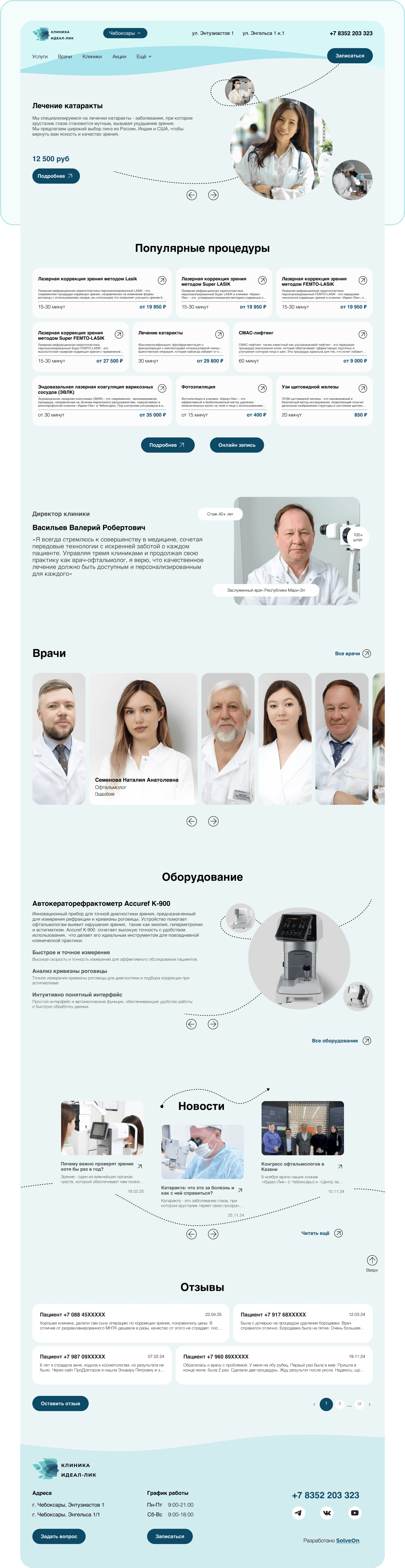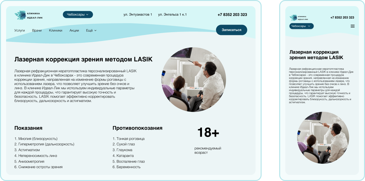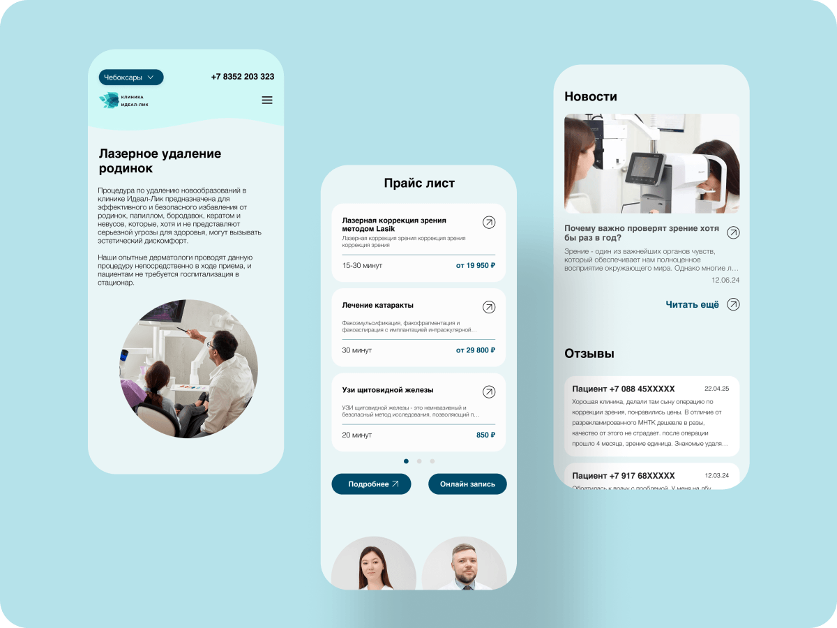 Основная цель — передать ощущение профессионализма, технологичности и заботы, сохранив при этом простоту восприятия и визуальную лёгкость. Сайт клиники «Идеал-Лик» создавался как часть единой цифровой экосистемы, ориентированной на пациента.