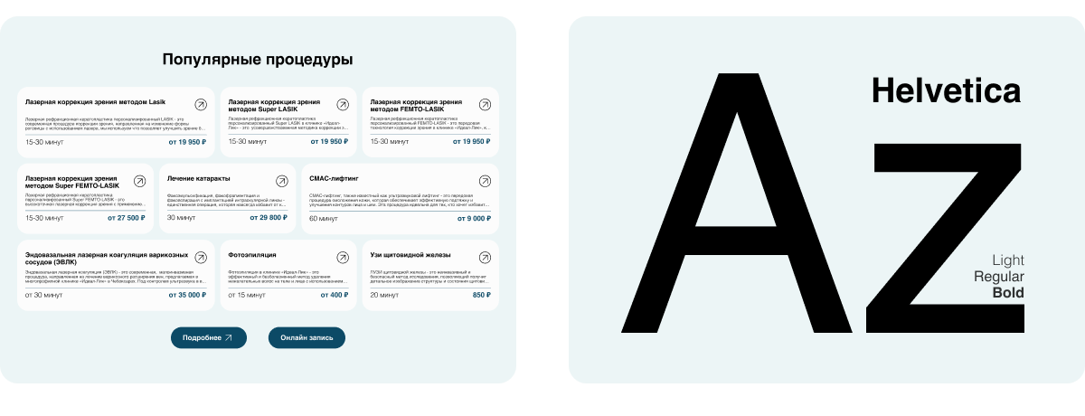 Для типографики мы использовали шрифты Inter и Helvetica — оба максимально читаемые и адаптированы для цифровых интерфейсов. Inter отвечает за современность и лёгкость восприятия, а Helvetica добавляет строгость и уверенность, что особенно важно для медицинского проекта, где доверие пользователя — ключевой фактор