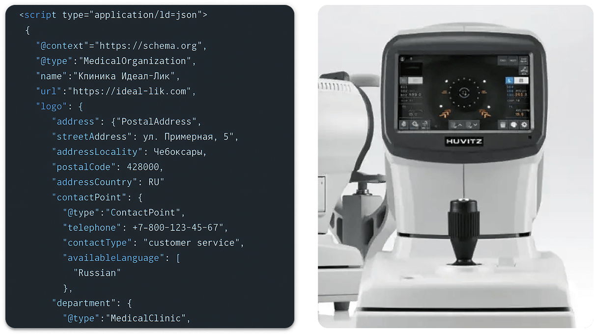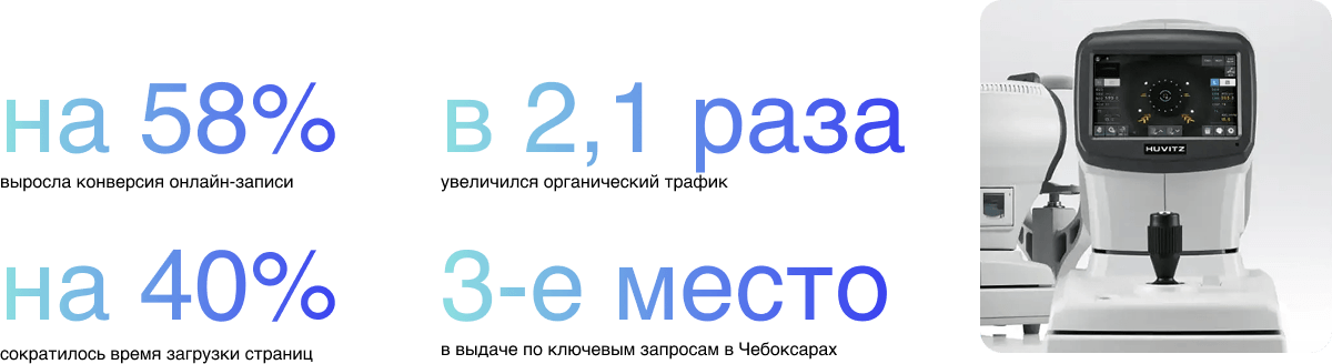 Работа по SEO началась с технической оптимизации: внедрение микроразметки для врачей и услуг, правильная структура заголовков, создание понятных URL и серверная генерация мета-данных. Мы добавили карту сайта, robots.txt, настроили интеграции с аналитикой. Основной акцент был на поисковый трафик по конкретным направлениям: "лазерная коррекция зрения в Чебоксарах", "лечение варикоза", "приём гинеколога" и др.