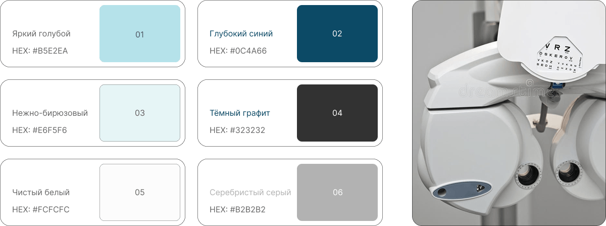 В качестве основного акцентного цвета был выбран бирюзовый — оттенок, который ассоциируется с чистотой, доверием и профессионализмом. Бирюзовый традиционно используется в медицинском дизайне, так как вызывает чувство спокойствия и уверенности, снижает тревожность пользователя и делает взаимодействие с интерфейсом более комфортным.