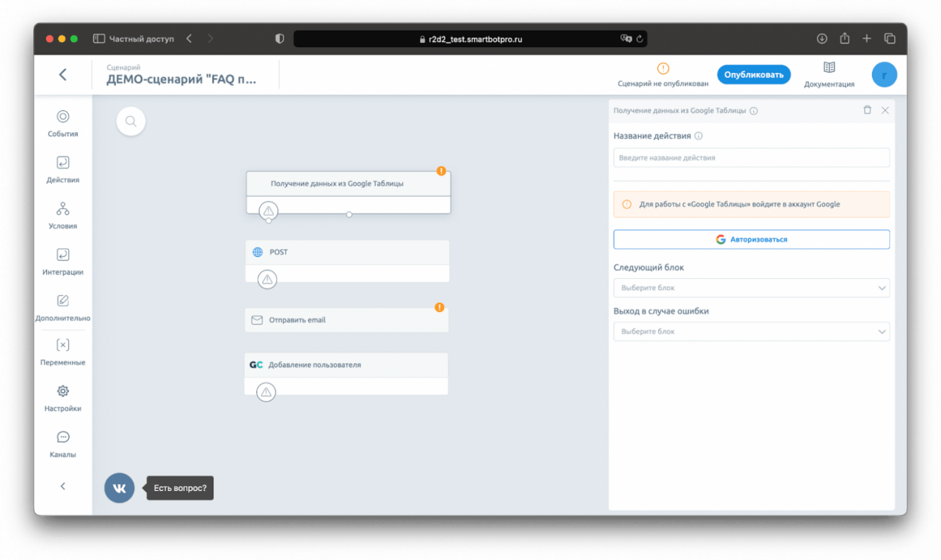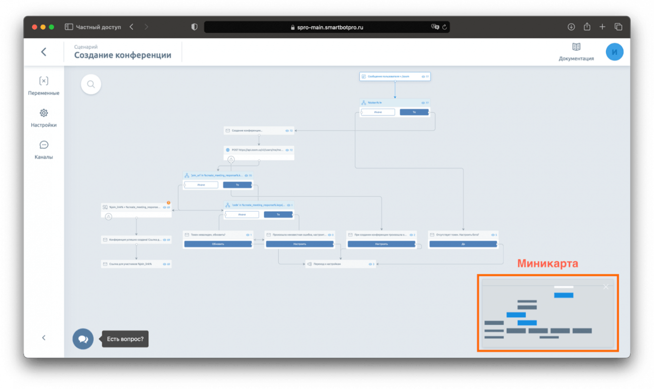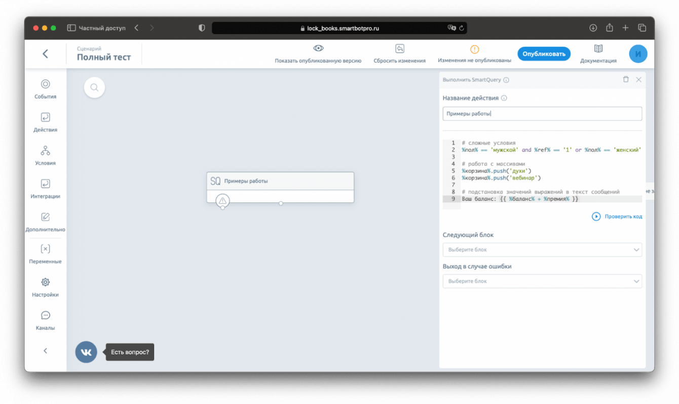— Порталы. Повторяющуюся логику мы не дублируем, а выделяем в отдельный сценарий, в который делаем переходы из других сценариев с помощью блока-портала. Например, если каждое взаимодействие нужно заканчивать сбором фидбека с пользователя.
