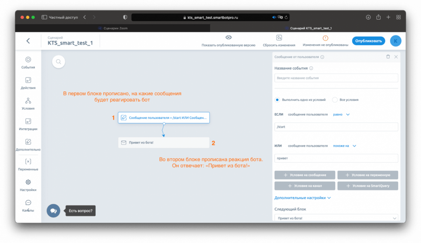 — Приоритет выбора сценария. Иногда может произойти так, что срабатывают сразу несколько условий событий. Например, у нас есть условия по ипотеке и условия по кредиту. Пользователь пишет: «условия». В стандартном случае бот выберет случайный сценарий из наиболее подходящих. Если банк хочет продвинуть свои ипотечные продукты, то можно настроить приоритет сценария условий по ипотеке. Тогда пользователи чаще будут узнавать именно об условиях по ипотеке.