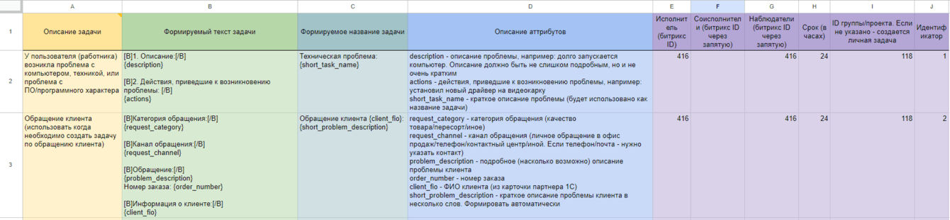 - Парсер шаблонов задач из Google-таблиц. Для гибкости и динамичности работы с задачами мы создали парсер для загрузки шаблонов задач из Google-таблиц. Шаблоны содержат параметры для создания задач в Bitrix24, а также условия, при которых следует вызвать ту или иную задачу.