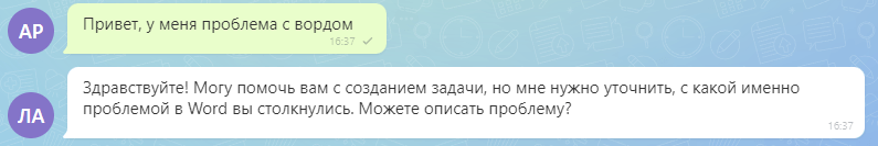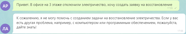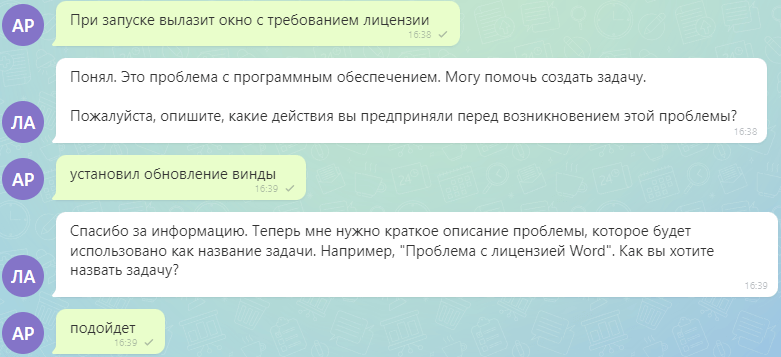 - Анализ запросов пользователей. Бот анализирует текст запроса на основе предварительно настроенных шаблонов, чтобы выбрать наиболее подходящий вариант для создания задачи.