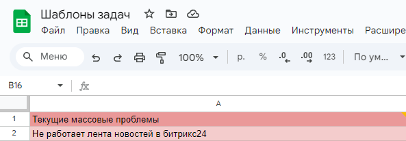 - Настройка шаблонов задач. Вместе с клиентом определили категории задач, список обязательных и опциональных параметров. Вся информация была вынесена в Google-таблицу, с которой бот синхронизируется каждые 15 минут.
