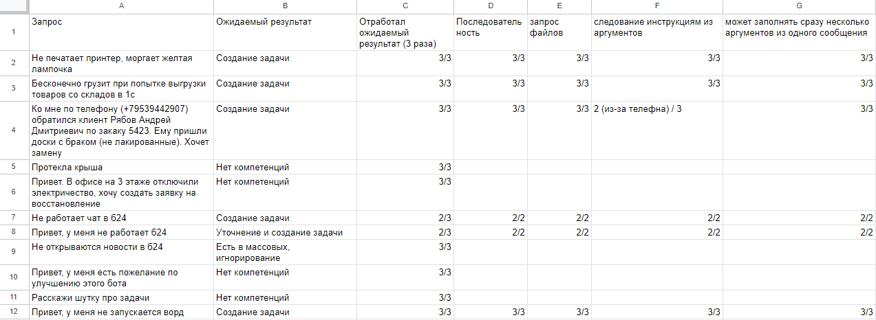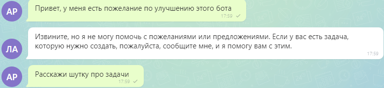 - Игнорирование запросов, не относящихся к задачам. Бот настроен на работу только с заранее заданными шаблонами задач, которые наш клиент настраивает в специальной Google-таблице. Эта таблица регулярно обновляется, что позволяет добавлять новые сценарии. Если запрос пользователя не соответствует ни одному из шаблонов, бот вежливо сообщает об этом и завершает диалог. Это помогает сосредоточиться только на значимых запросах и не тратить время на нерелевантные вопросы.