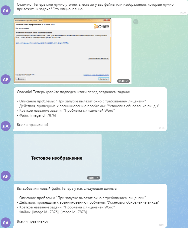 Загрузка файлов из битрикс24: Изначально было неясно, как интегрировать загрузку файлов в текстовой модели. Мы решили эту задачу следующим образом: при получении сообщений с вложениями, агент получает информацию о типе файла и его ID на диске Битрикс24. И уже при вызове нужной функции, агент передает список этих ID, которые используются при создании задачи в Битрикс24.