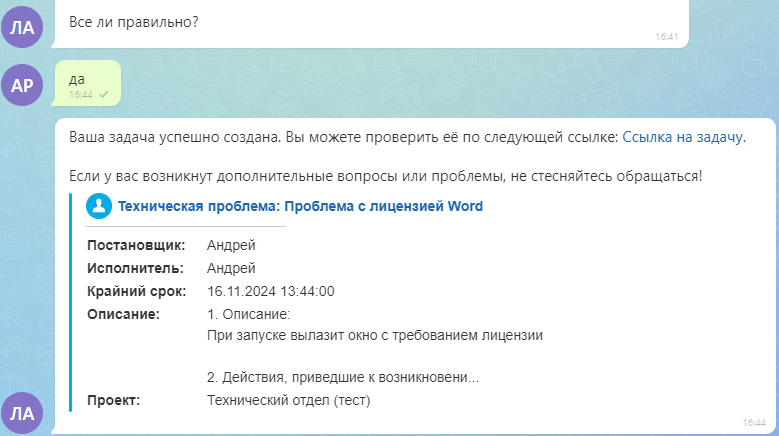- Создание и диспетчеризация задач. После того как пользователь указал все необходимые данные, бот автоматически определяет исполнителей, добавляет наблюдателей, устанавливает дедлайны и отправляет задачу в нужную группу.