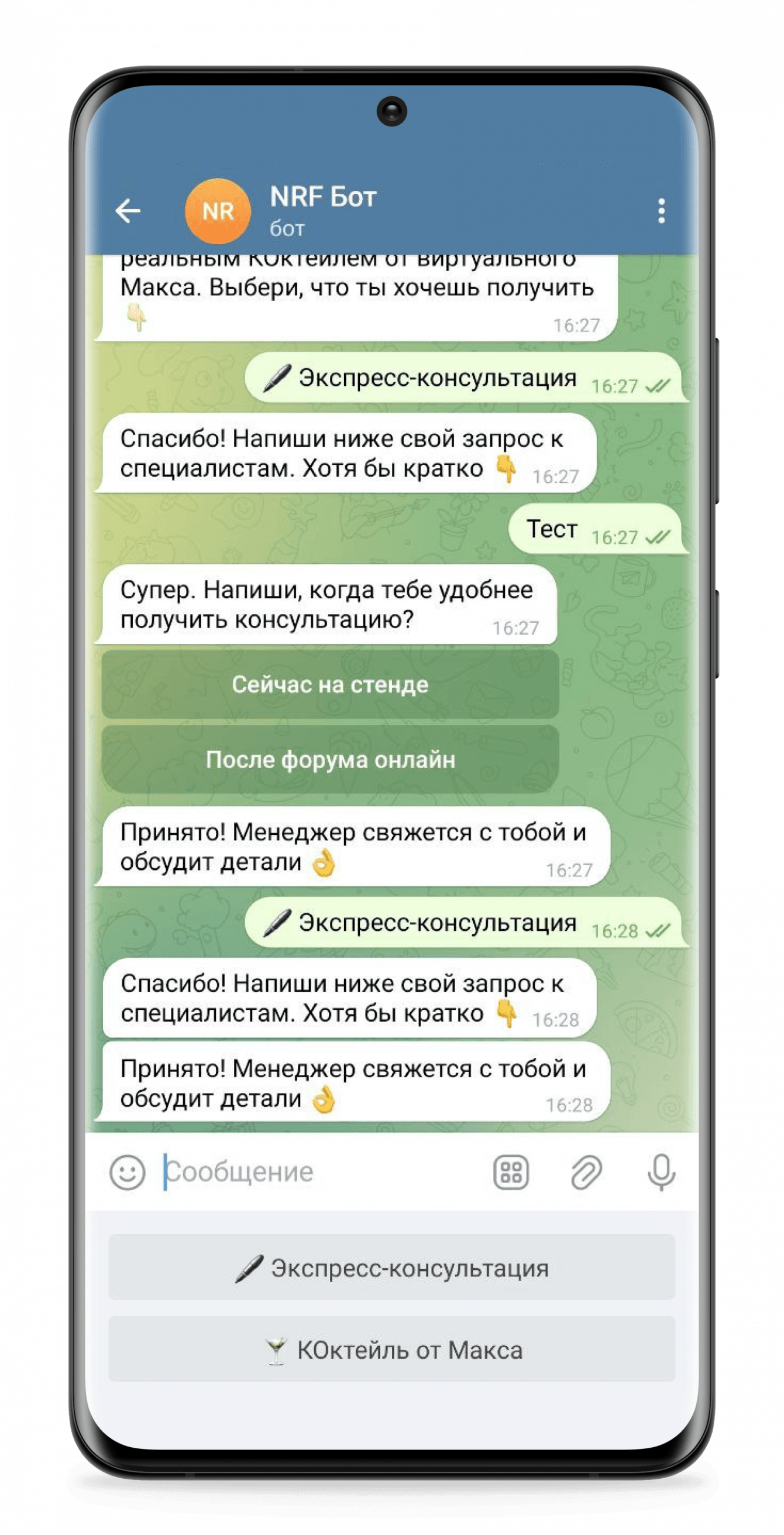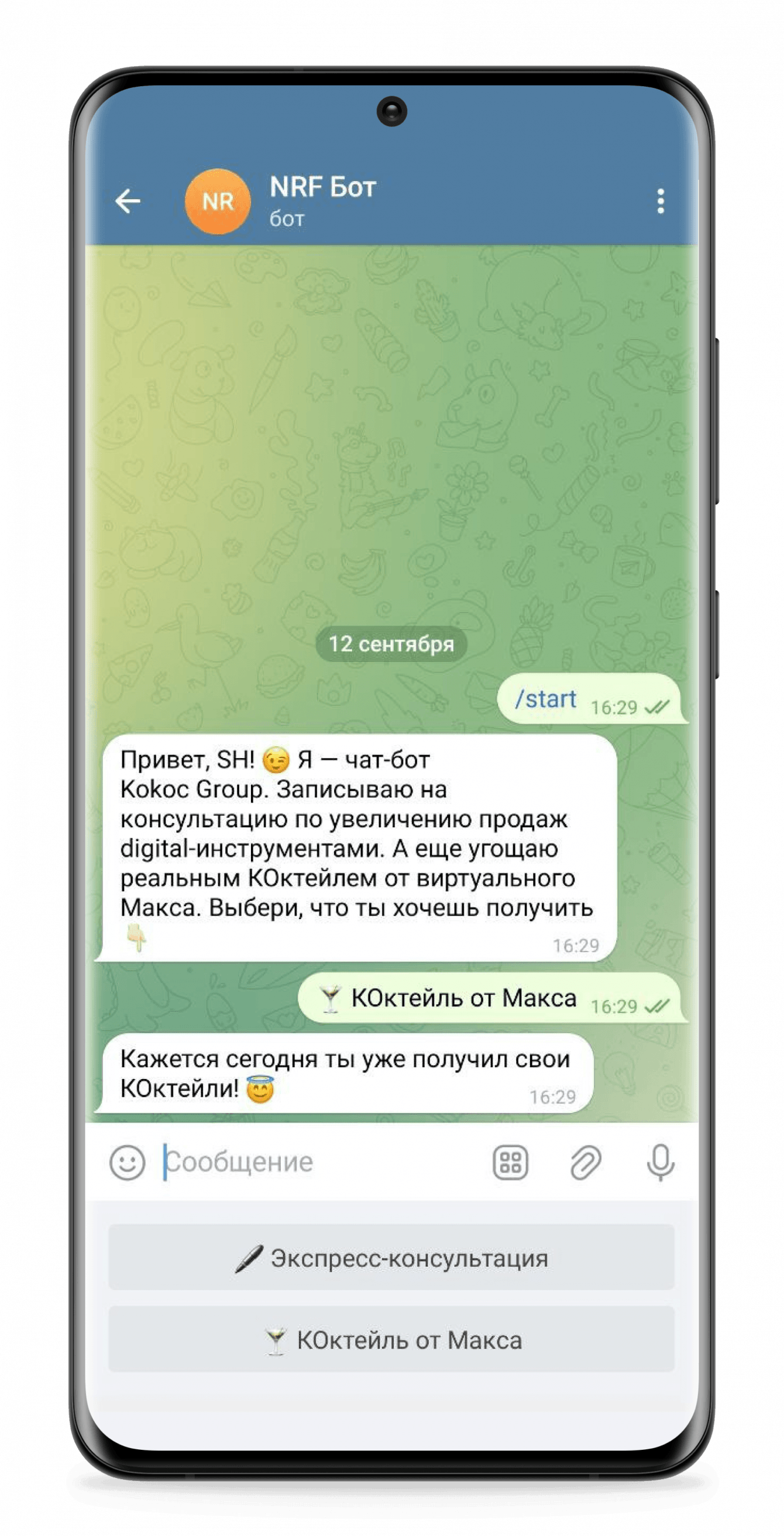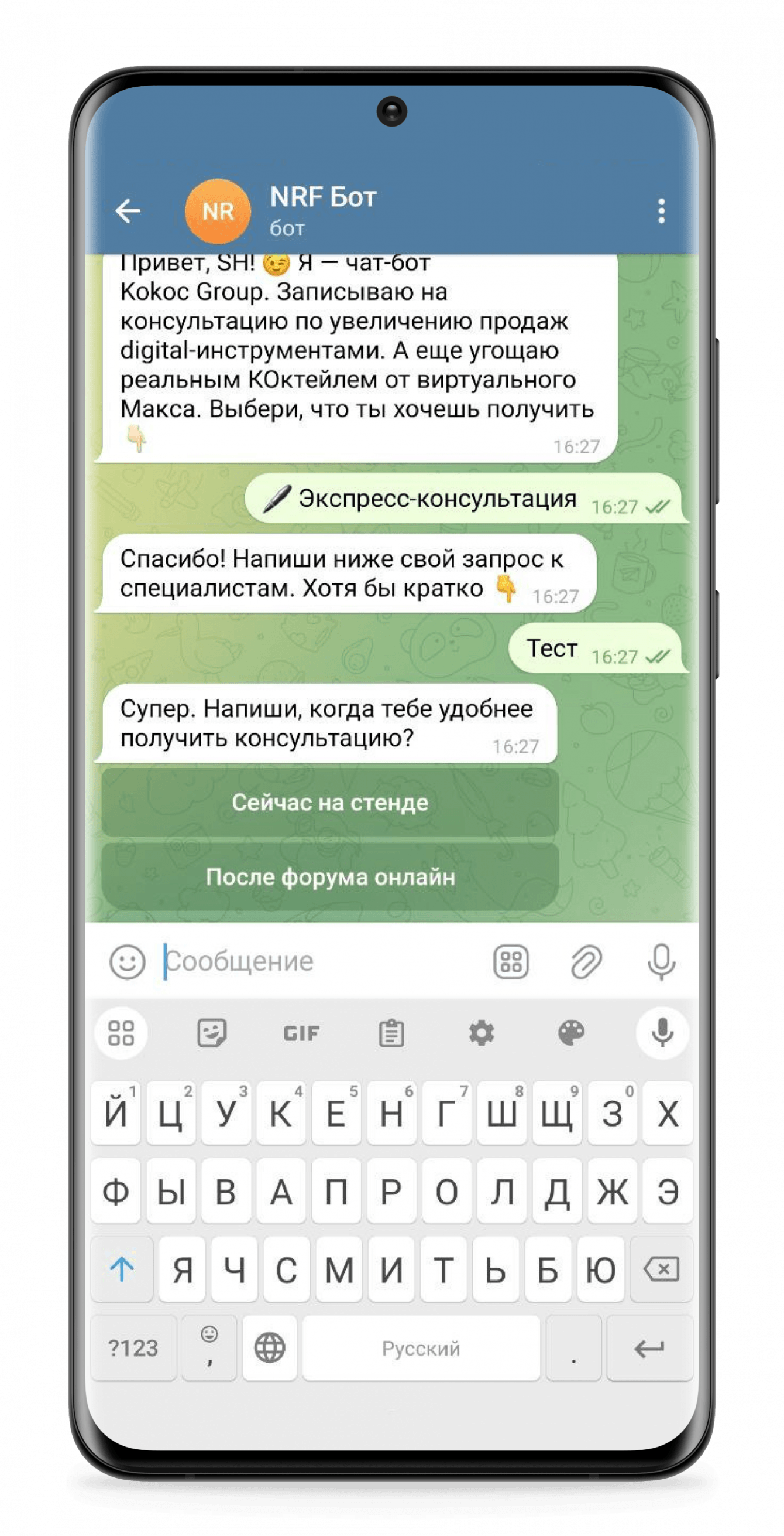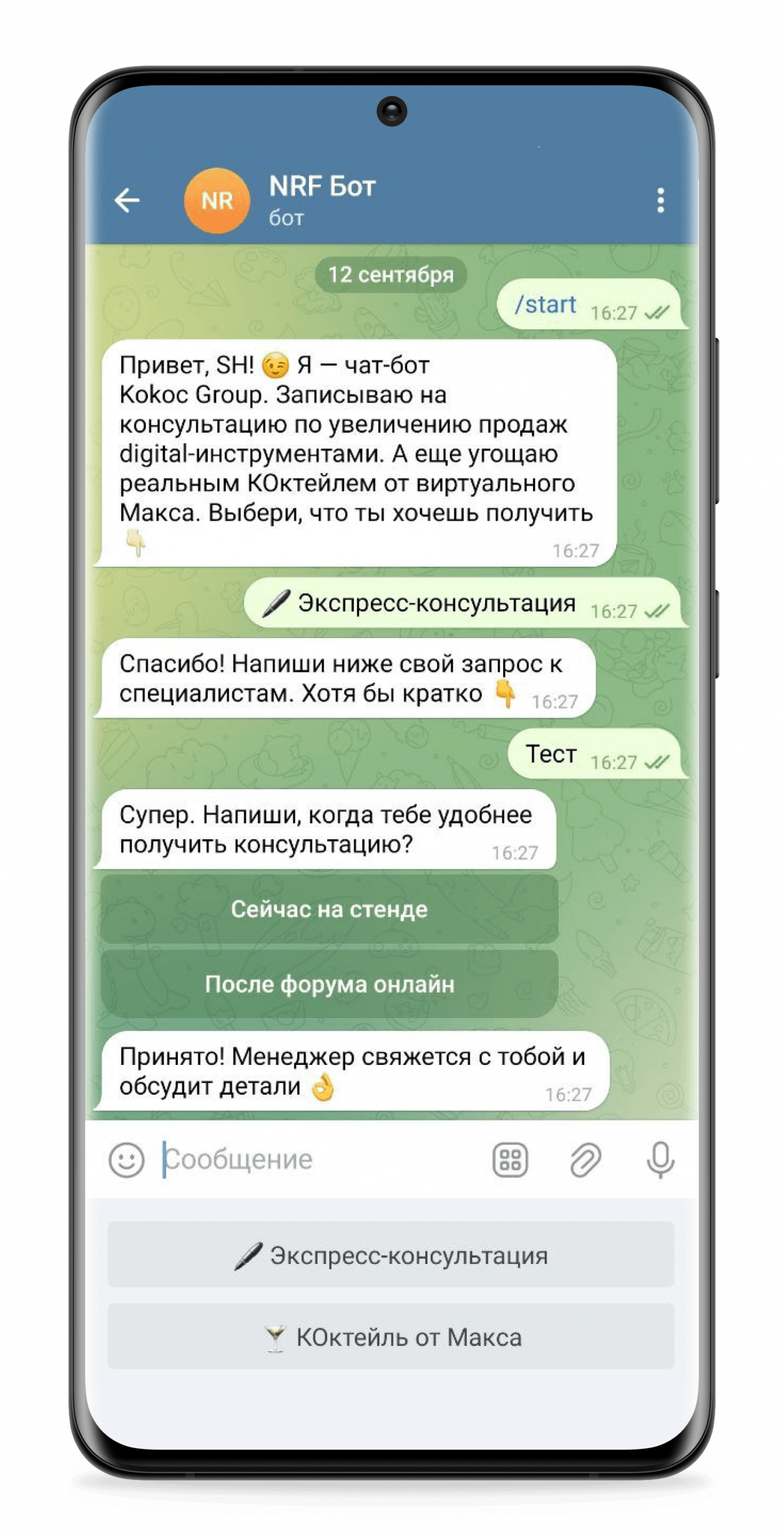 В чат-боте участники могли записаться на консультацию по увеличению продаж digital-инструментами. Пользователи могли выбрать вариант удобного получения консультации: