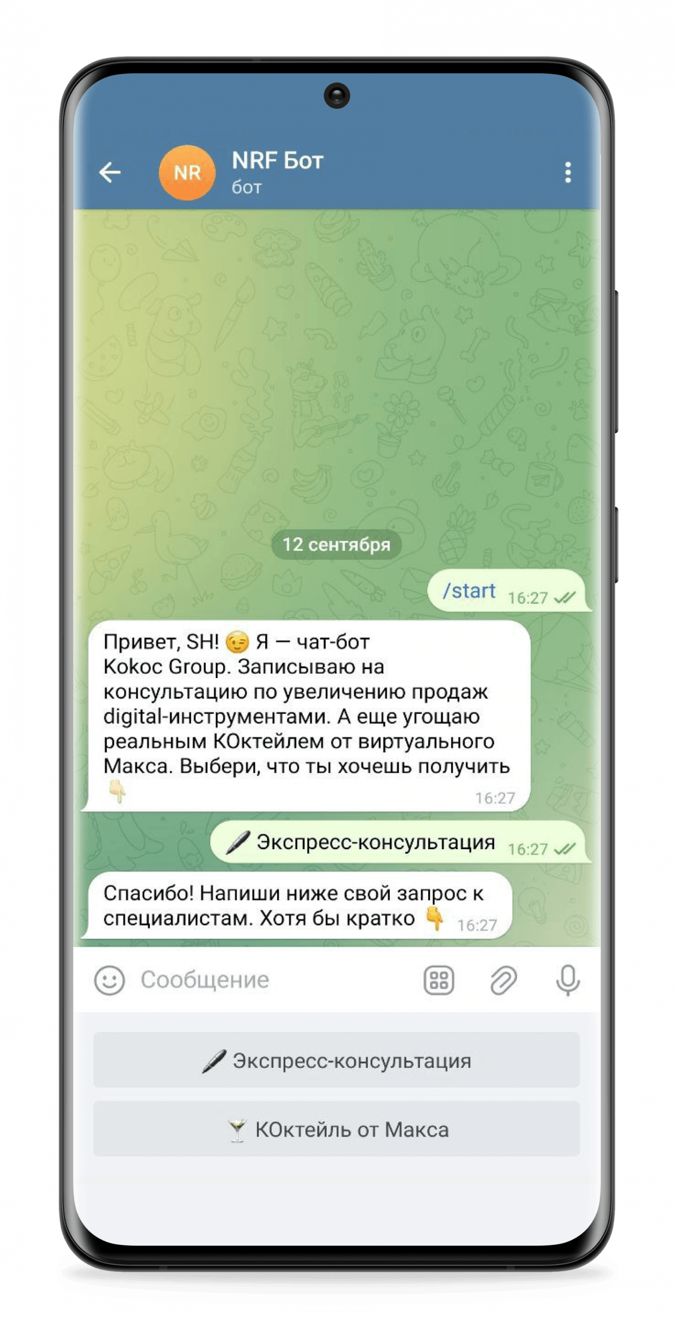 В чат-боте участники могли записаться на консультацию по увеличению продаж digital-инструментами. Пользователи могли выбрать вариант удобного получения консультации: