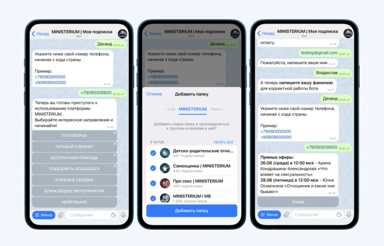 После оплаты выбранного тарифа пользователь получает возможность добавить к себе папку с шестью каналами, входящими в цифровую экосистему. Помимо этого пользователю создаётся личный кабинет на платформе GetCourse, и он получает доступ к материалам, находящимся там. Обладатели подписки могут получить информацию о ближайших мероприятиях, воспользоваться бесплатной психологической поддержкой, подобрать психолога по своим критериям и узнать о возможных клубных скидках на другие услуги.