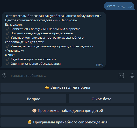 Подобный чат-бот хорош для медицинских центров тем, что «запись на прием» интегрирована с уже работающей МИС, что невозможно полноценно сделать на платформах-конструкторах.
