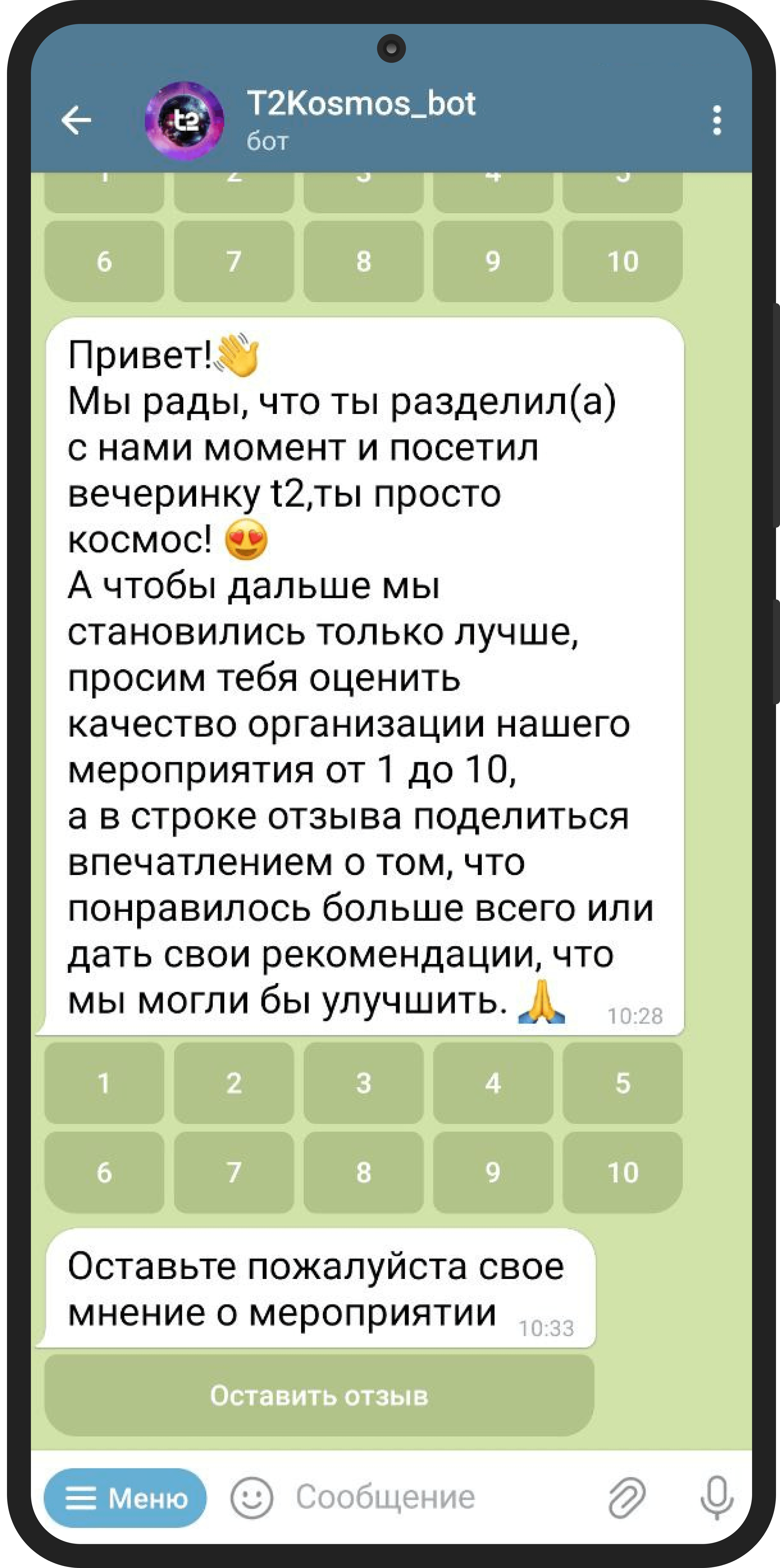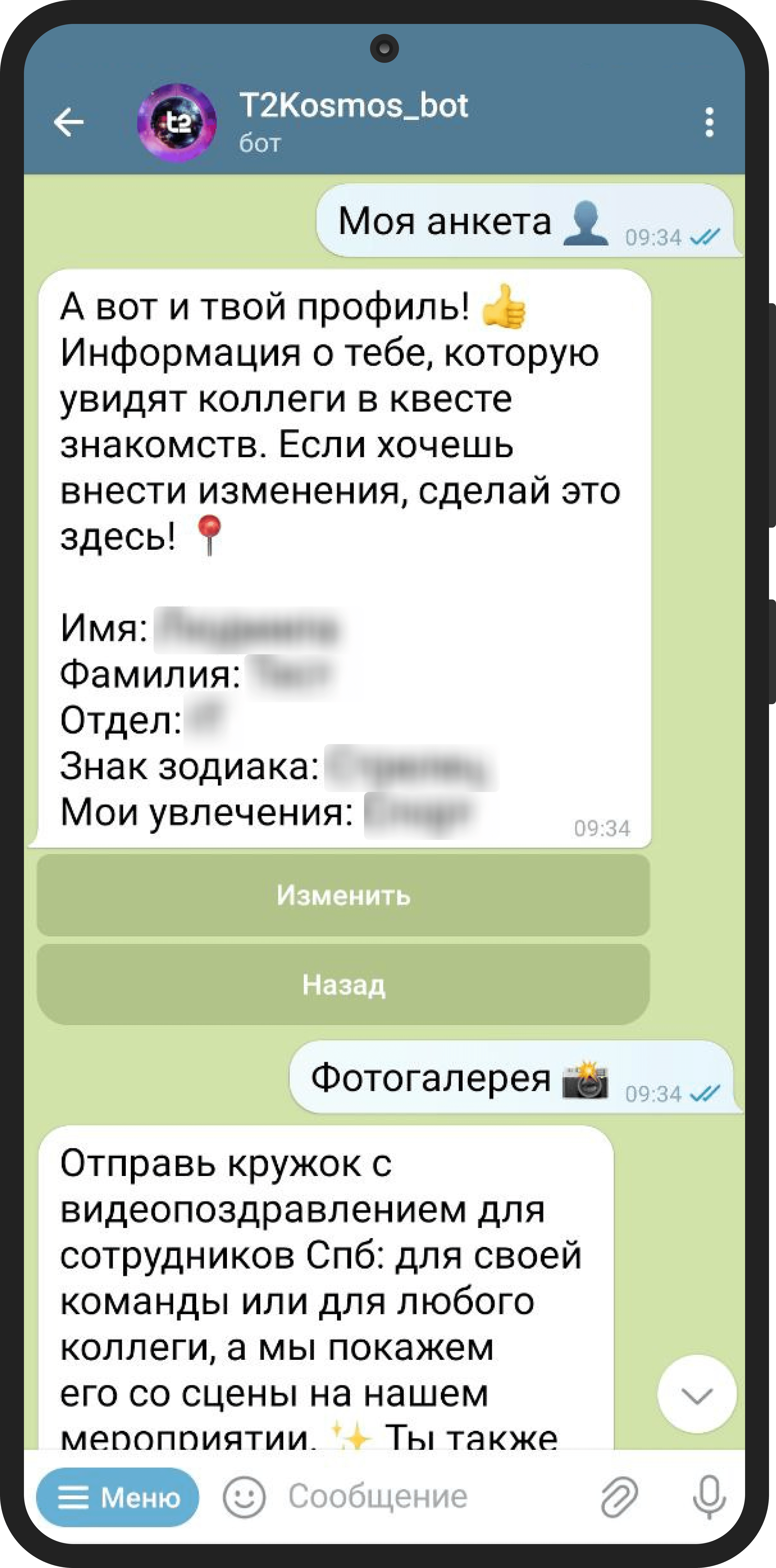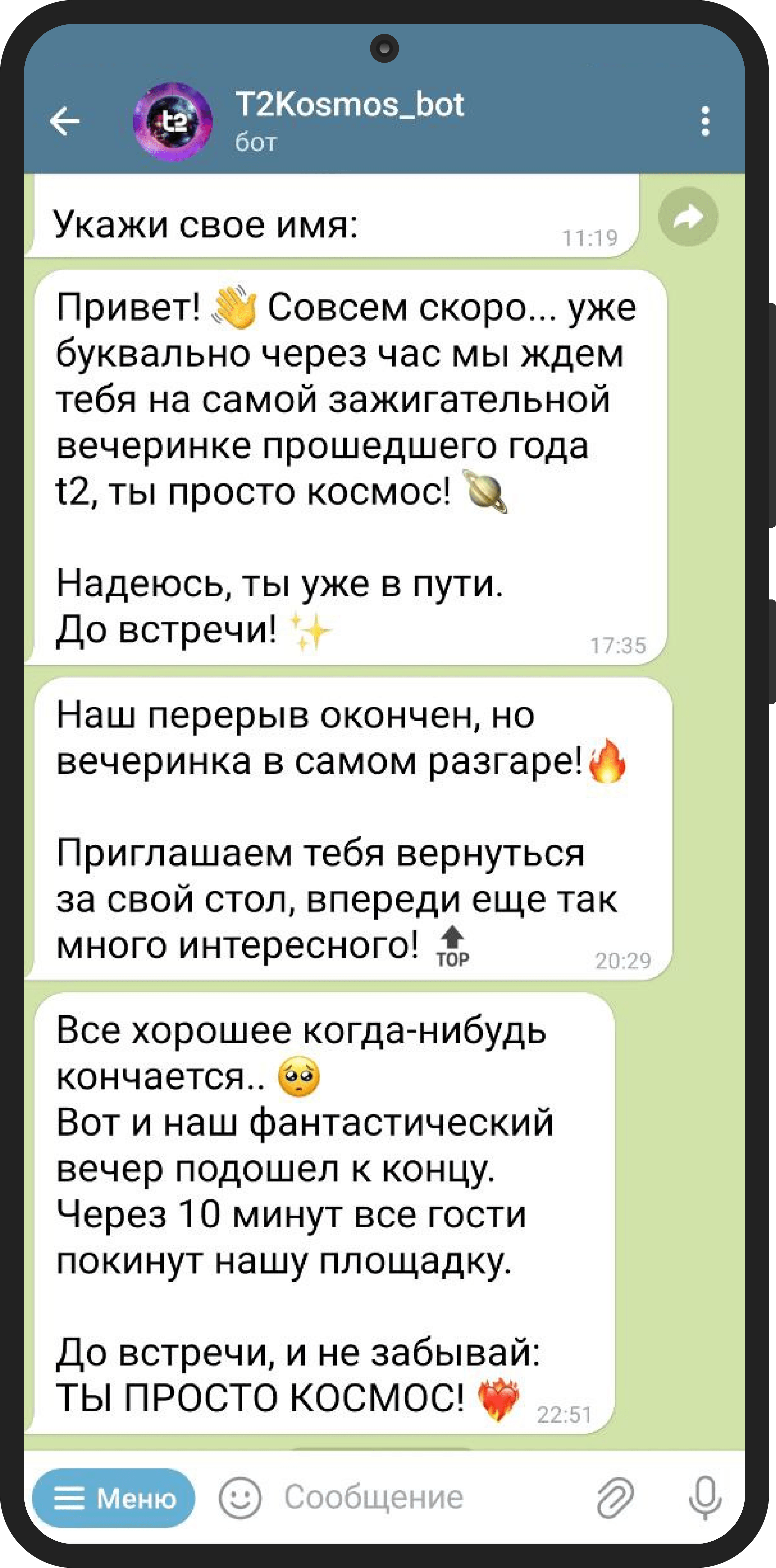 Заказчик остался доволен результатом, отметив удобство и функциональность бота. Он обеспечил удобное информирование сотрудников, организовал нетворкинг, внедрил интерактивное взаимодействие во время корпоратива, повысил вовлеченность участников и упростил коммуникации между ними и руководством.