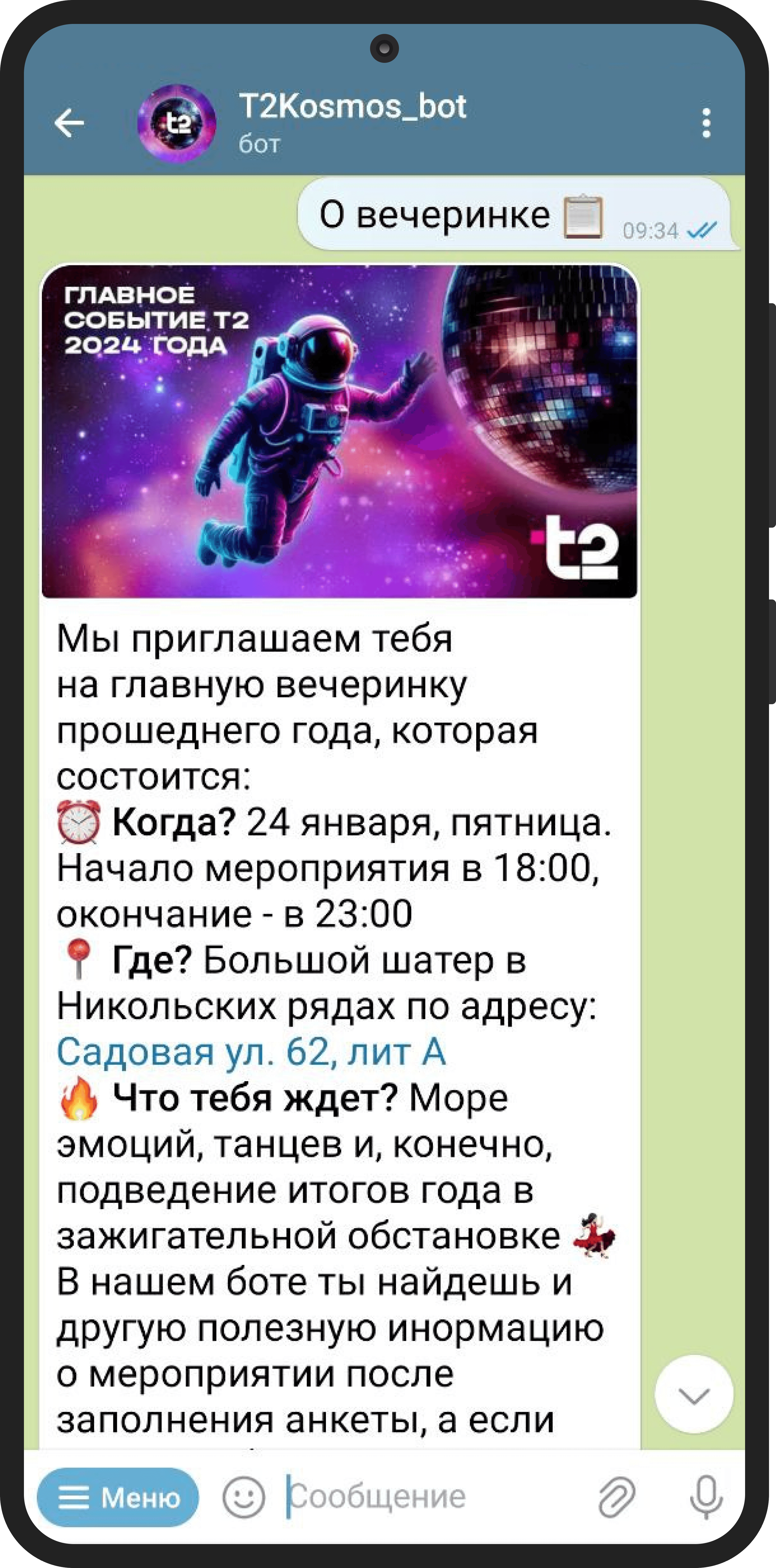 - Пользователь мог ознакомиться с информацией (место проведения корпоратива, дресс-код, как доехать, парковка)