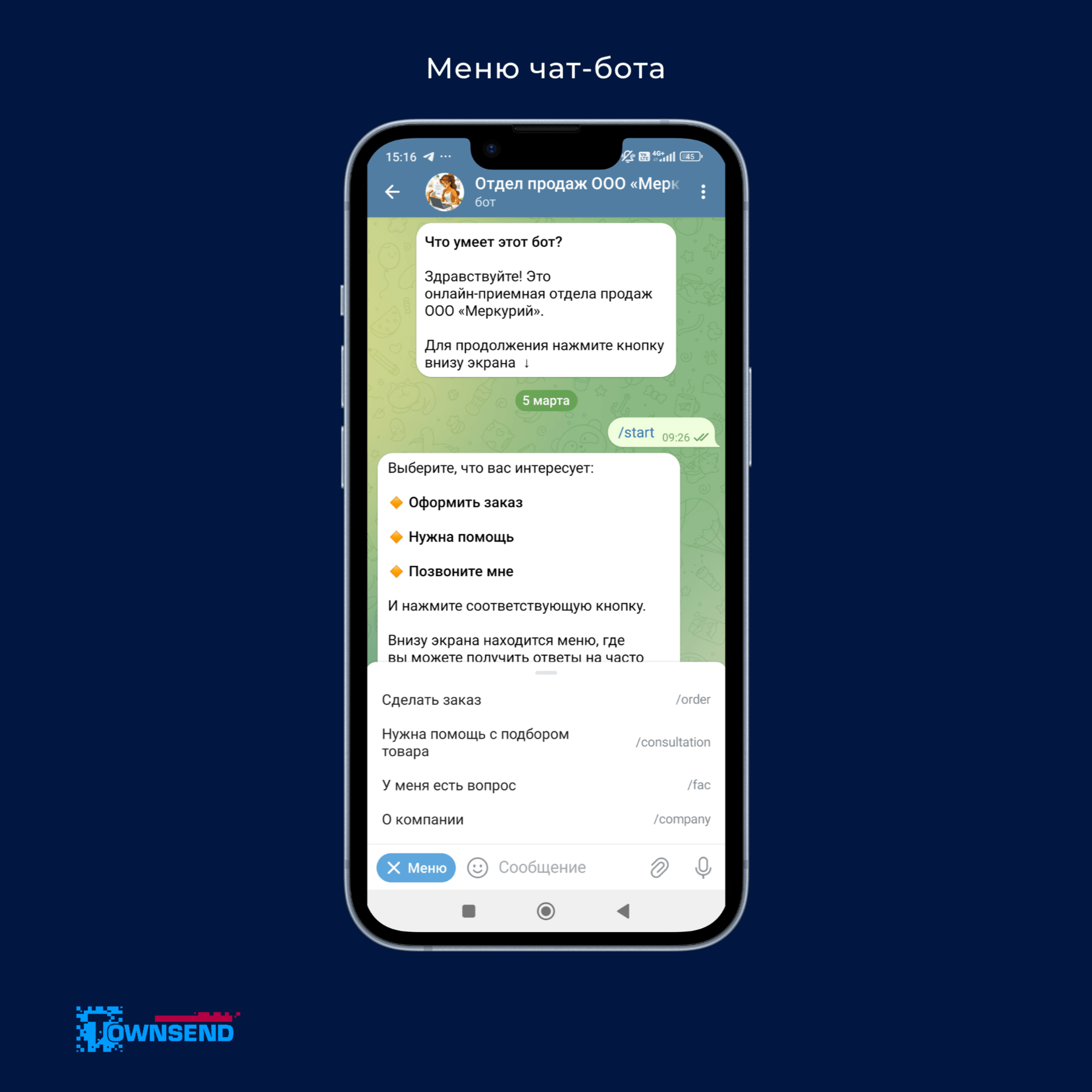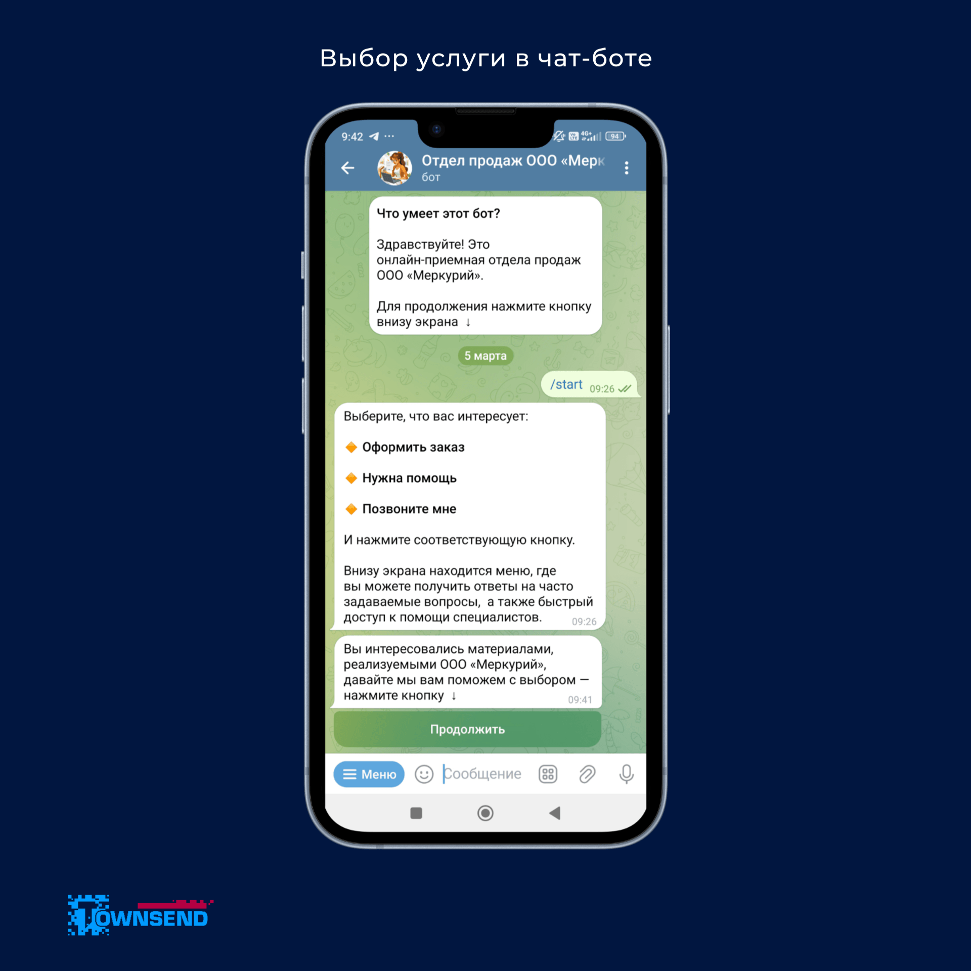 Чат-бот реализован в формате посадочной воронки, где подписчик может получить одну из трёх услуг: