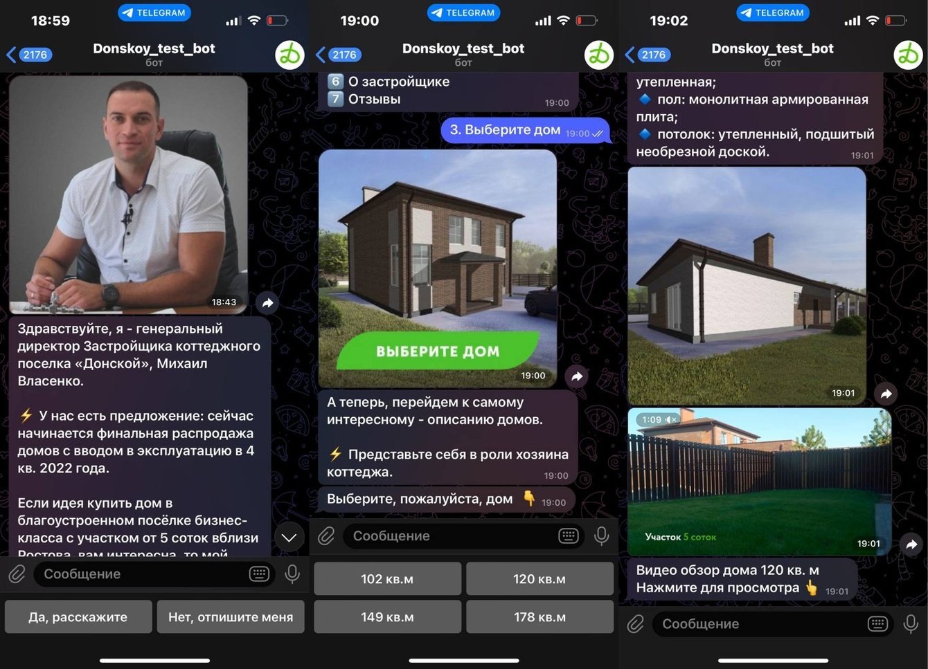 В каждом разделе посетитель может оставить заявку на консультацию или экскурсию. Выбор последовательности - за клиентом, он сам переходит в интересующую его ветку. Если клиент пока не готов общаться с менеджером, то бот продолжает знакомство с поселком.