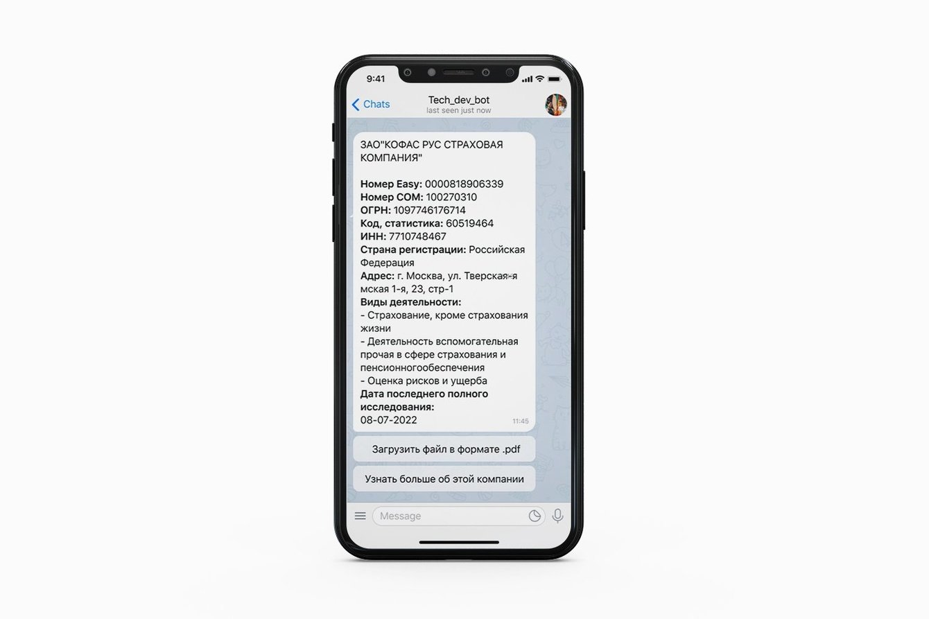 Дополнительно была сделана интеграция с сервисом проверки юридических лиц. Водителю отправляется информация о заказчике в момент отклика на заказ, чтобы он мог убедиться в его благонадежности.