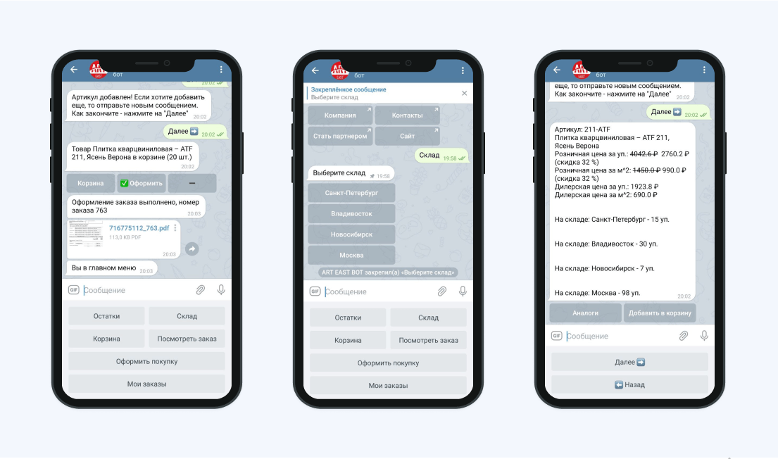 Через эту команду клиент может найти остатки на складах по артиклю. По найденным товарам система возвращает сообщение с возможностью добавить товар в корзину или найти его аналоги. Остаток по каждой позиции номенклатуры приходит отдельным сообщением. Под каждым таким сообщением выведены две кнопки «Аналоги» и «Добавить в корзину». При нажатии на эти кнопки можно запустить два сценария.